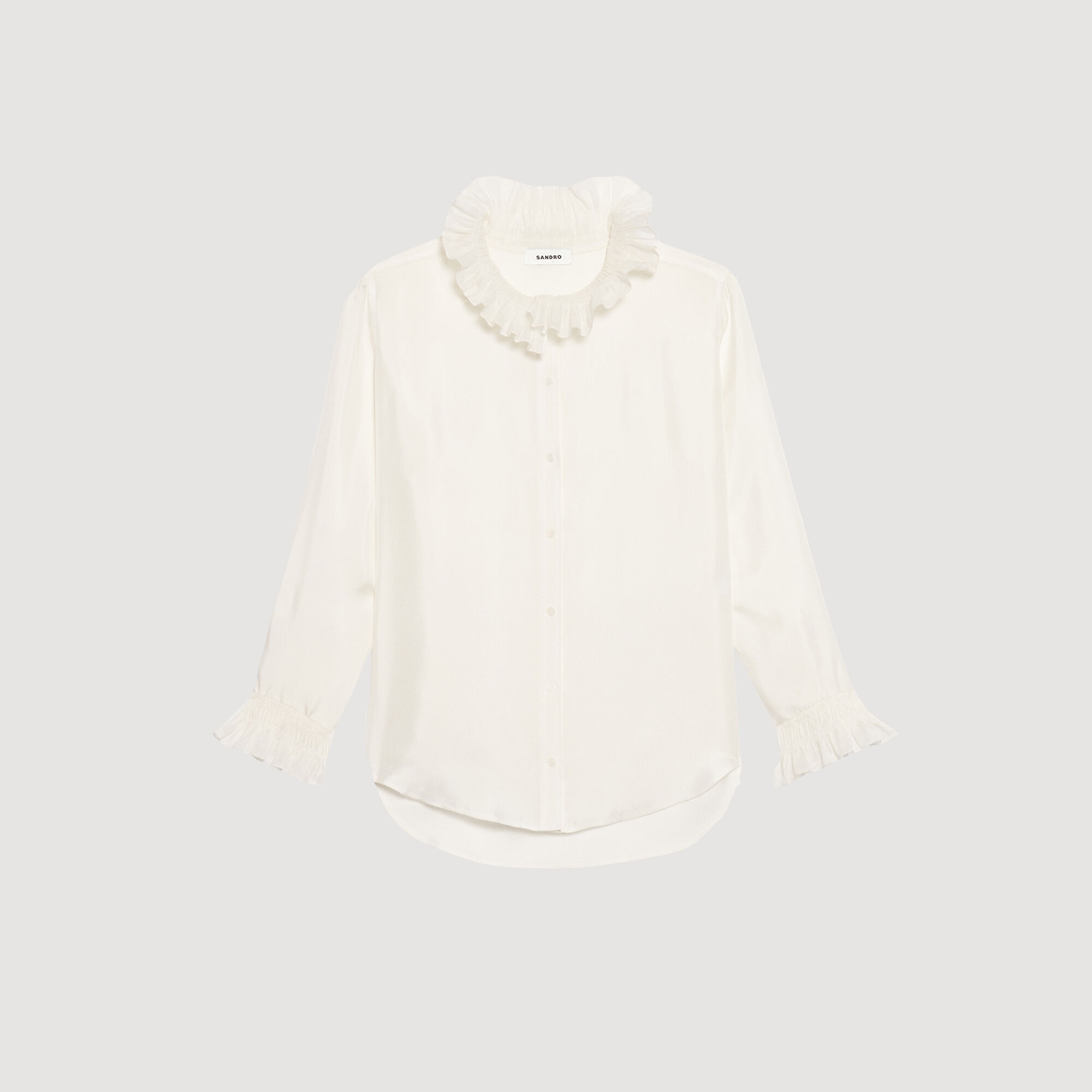 Sandro women's shirt • Silk floaty shirt • Smocked-effect gathered collar • Long sleeves with gathered cuffs • Rounded asymmetric hem The model is 5'10" tall and wears a size 1 FR / 4 US COMPOSITION Main fabric: 100% silk Secondary fabric: 67% linen, 33% silk Buttons: 100% nacre Reference: SFPCM00517_11