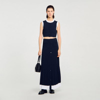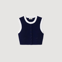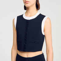Sleeveless short cardigan in fine knit with round neck, button placket and contrasting edge trims. - Sandro Women's short knit cardigan - Round neck - Sleeveless - Contrasting trims - Decorative piped pockets - Button fastening - Designed for a cropped fit Reference: SFPPU02636_44 COMPOSITION & CARE Composition - Main fabric: 52% viscose, 45% polyamide, 3% elastane Care advice - Hand wash - Do not bleach - Do not tumble dry - Iron at a maximum temperature of 110°C without steam - F - Professional dry clean, with hydrocarbon solvent, normal treatment
