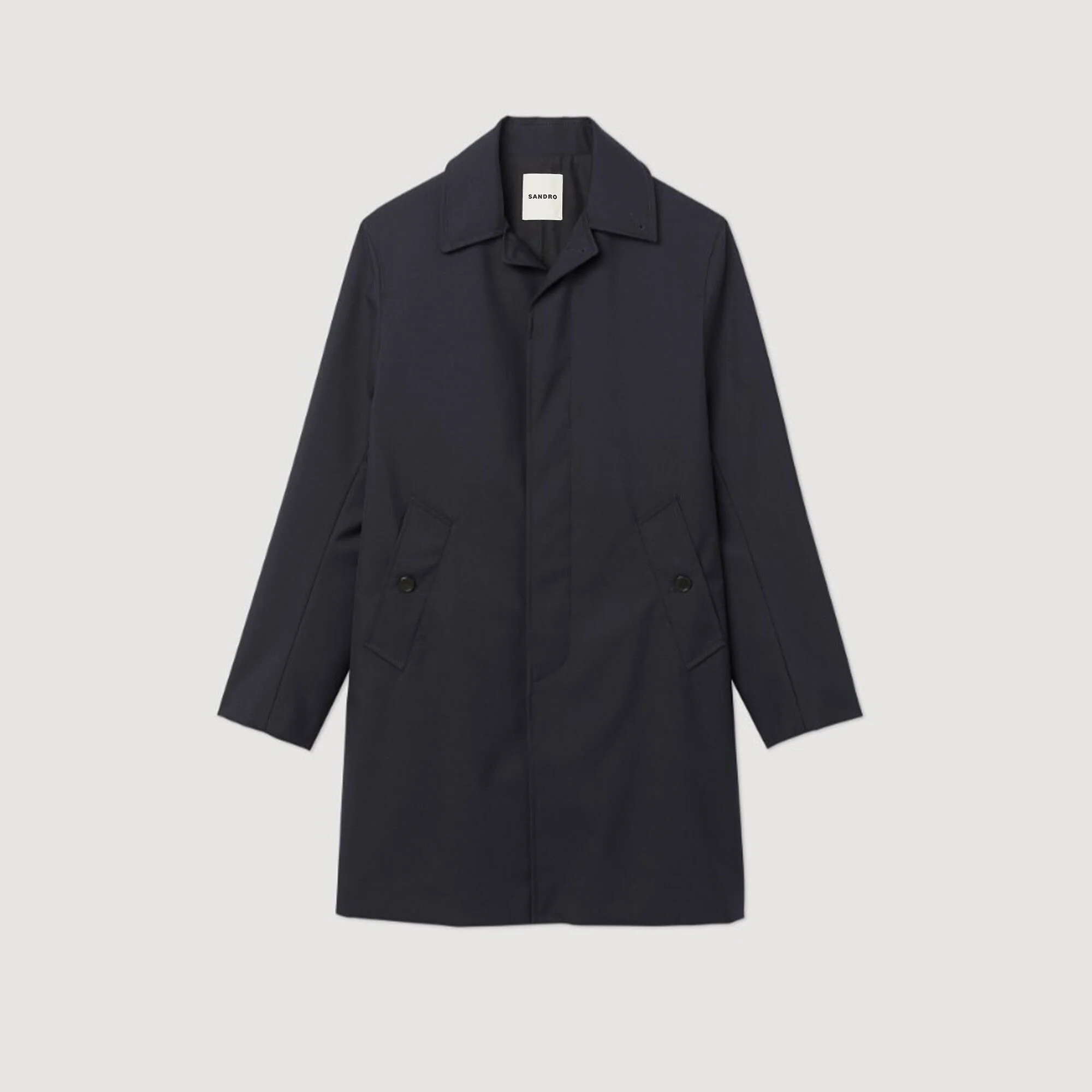 Mac made from technical fabric with long sleeves, lapel collar, covered placket fastening and slanted pockets. Sandro Men's waterproof raincoat Technical fabric Lapel collar Long sleeves Button fastening with covered placket 2 buttoned pockets Inner lining Inside pockets The model is 189 cm / 6'1 tall and wears a size S COMPOSITION Main fabric: 57% polyester, 43% wool Body lining: 100% polyester Sleeve lining: 100% viscose Pocket lining: 100% cotton Reference: SHPMA00349_44