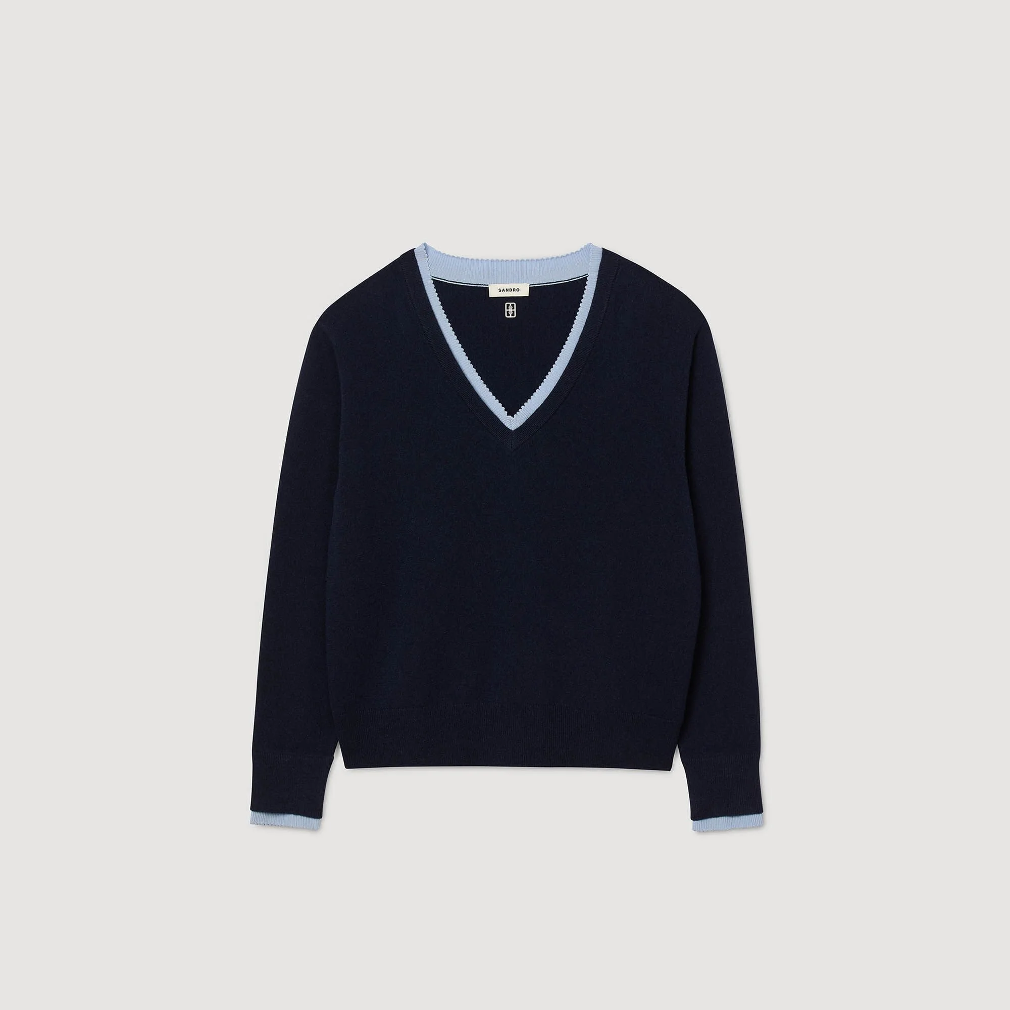 Fine knit sweater with V-neck, long sleeves and contrasting neckline finish. - Sandro Women's knit sweater - Wool and cashmere - Long sleeves - V-neck with contrasting trim - Ribbed edges - Designed for a boxy fit Reference: SFPPU02686_44 COMPOSITION & CARE Composition - Main fabric: 91% wool, 9% cashmere - Secondary fabric: 71% viscose, 29% polyamide - Rib: 88% wool, 8% cashmere, 3% polyamide, 1% elastane Care advice - Hand wash - Do not bleach - Do not tumble dry - Iron at a maximum temperature of 110°C without steam - F - Professional dry clean, with hydrocarbon solvent, normal treatment