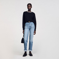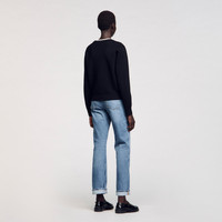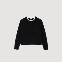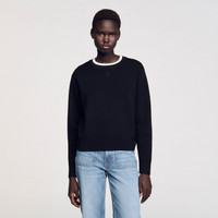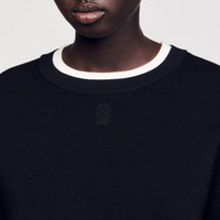 Wool-blend jumper featuring a round neck with contrasting stripes and long sleeves. Sandro Women's knit jumper Wool blend Round neck Contrast trim on neck Long sleeves The model is 177 cm / 5'10 tall and wears a size 1 FR / S COMPOSITION Main fabric: 43% wool, 30% polyamide, 27% viscose Embroidery: 100% wool Under collar: 62% cotton, 23% viscose, 15% polyamide Rib: 91% wool, 9% polyamide Reference: SFPPU02452_20
