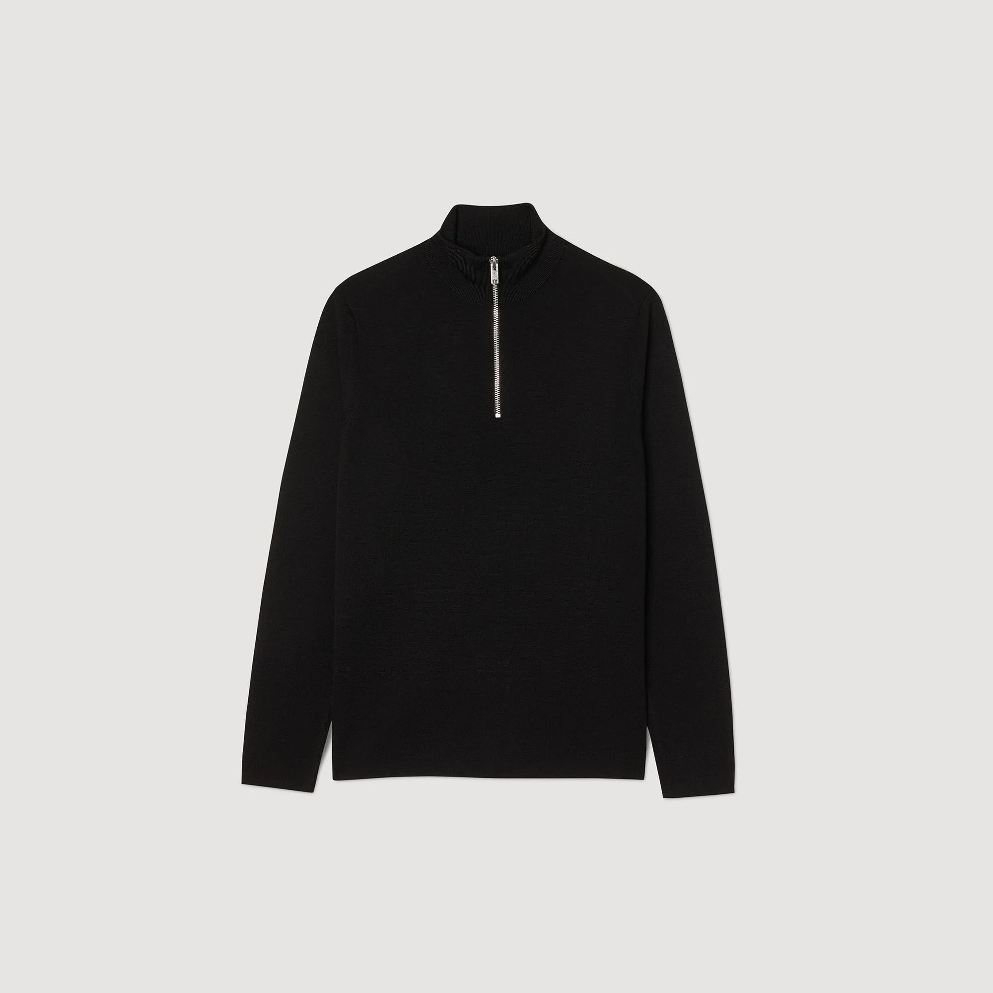 Sandro men's sweater • Knitted sweater with high neck • 100% wool • Zip at the collar • Ribbed trim finish Model is wearing a size S and is 6'1'' The wool in this item comes from extensive farming, which respects animal welfare and contributes to the preservation of local biodiversity. The model is 187 cm / 6'1 tall and wears a size S / 8 UK COMPOSITION Main fabric: 100% wool Collar: 90% wool, 9% polyamide, 1% elastane Reference: SHPTR00161_B224