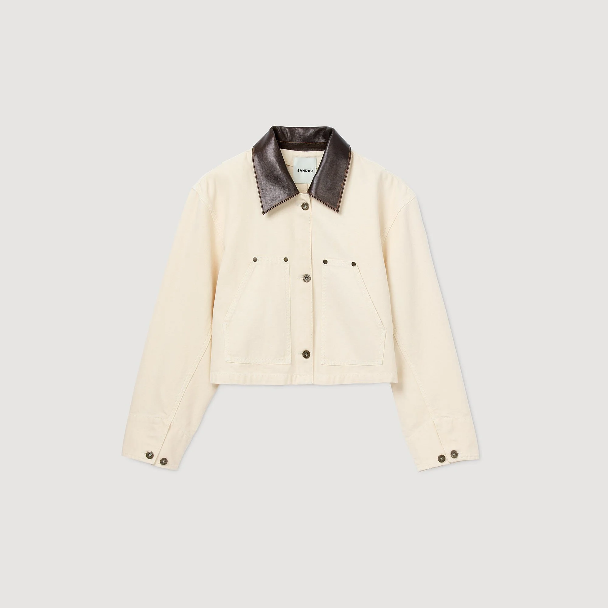 Workwear cotton jacket with contrasting lamb leather collar, long sleeves with buttoned cuffs, button fastening, and patch pockets with rivets. - Sandro Women's workwear cotton jacket - Contrasting lamb leather collar - Button fastening - Long sleeves with buttoned cuffs - Patch pockets with rivets - Worn effect finish on the hem Reference: SFPBL01229_11 COMPOSITION & CARE Composition - Main material: 100% cotton - Collar: lambskin leather Care advice - Do not wash - Do not bleach - Do not tumble dry - Do not iron - F/ - Professional dry clean, with hydrocarbon solvent, gentle treatment