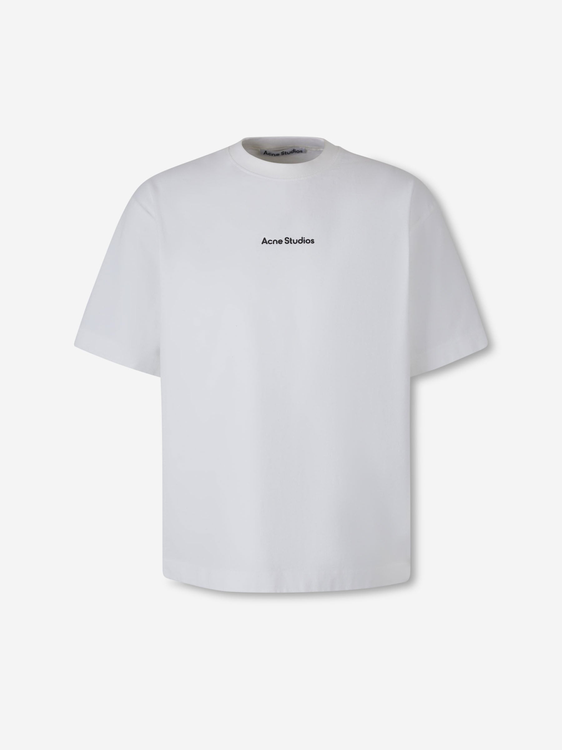 SKU: 553-004353 02 BRAND ID: FN-UX-TSHI000051 T-shirt by Acne Studios • Made of medium-thickness cotton jersey • Logotipo del sello de Acne Studios • Costuras planas en hombros y costuras laterales • Rounded collar • Short sleeve • Ribbed collar Made in Portugal Back length: 74 cm 100% organic cotton