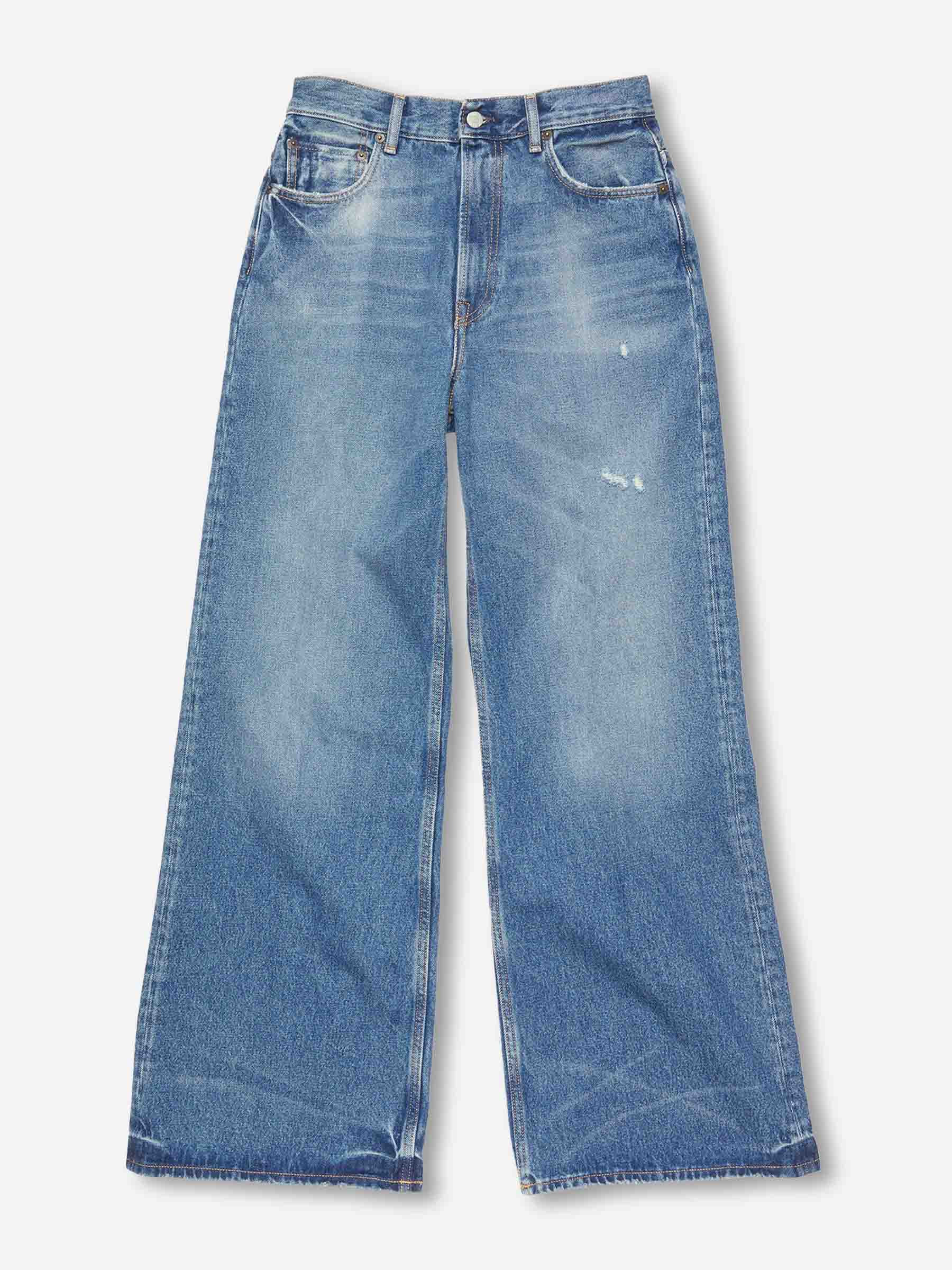 SKU: 763-001755 01 BRAND ID: A00379- Wide Jeans 2022 Wide jeans By Acne Studios • Five pockets: two front, one coin, and two back • High waist with belt loops • Worn and textured appearance • Classic fit • Crafted from high-quality cotton denim • Wide jeans • Straight hem • Front closure with zipper and metal button Composition: 100% cotton Made in: Italy