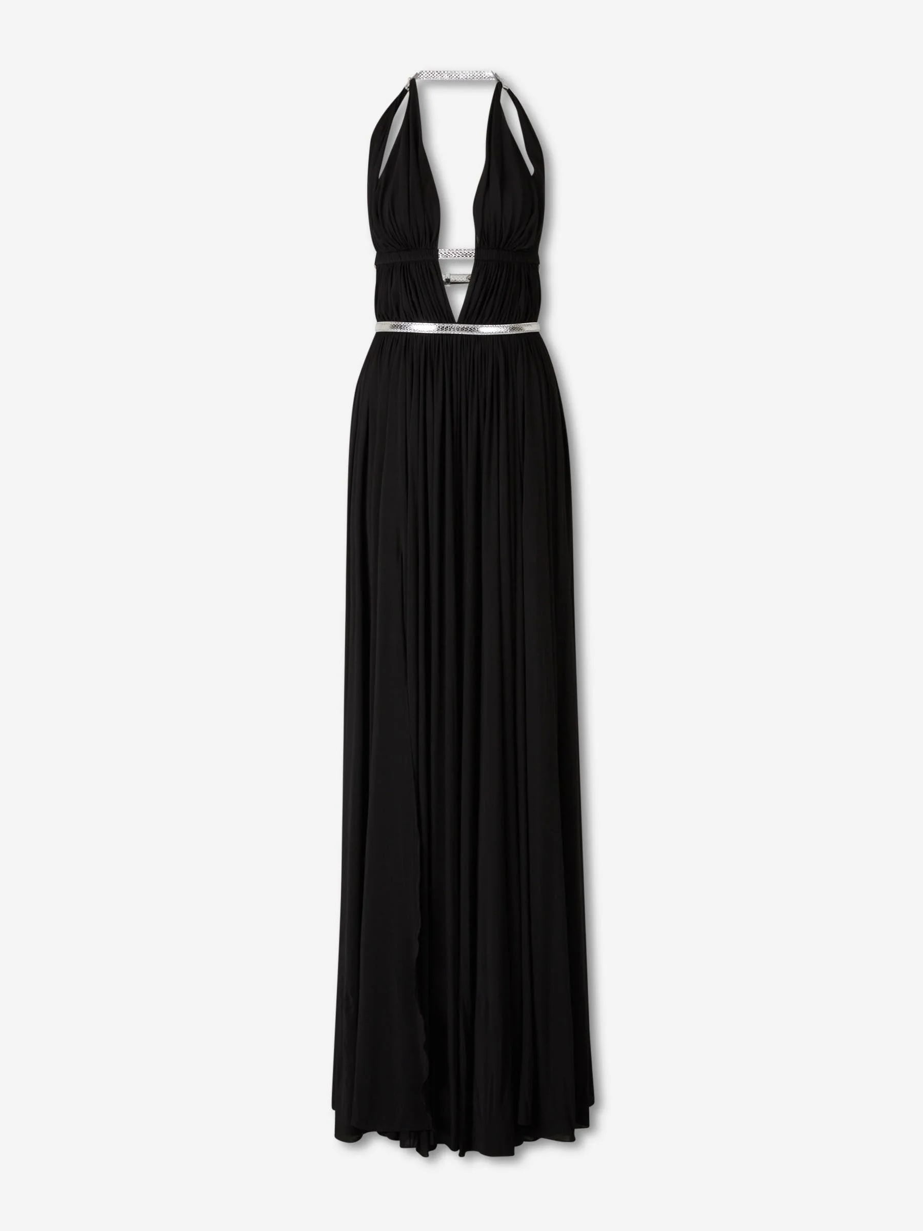 SKU: 732-001630 01 BRAND ID: AA9R2936J050C Dress By Alaia • Pleated Maxi Dress • Maxi dress • Body-hugging fit with defined contours • Made from viscose jersey fabric • Metallic elaphe details • V-neck • Draped design • Composition: 96% viscose, 4% elastane • Made in: Italy