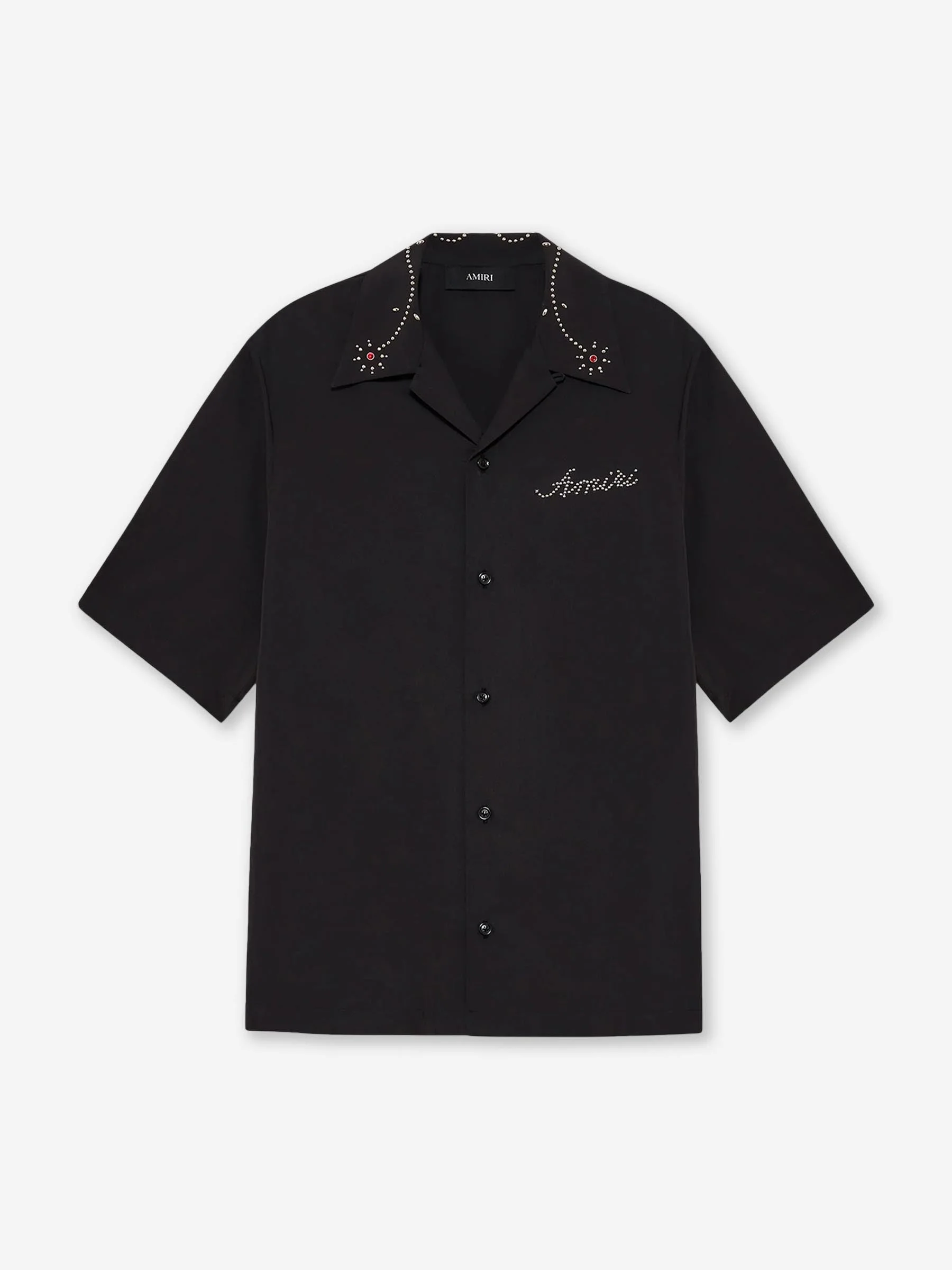 SKU: 532-000724 01 BRAND ID: AMTOSH1013 Shirt By Amiri • Casual shirt • Regular fit • Made from modal and polyester fabric • Classic collar • Front closure with tonal buttons • Stud embellishments and shiny rivets • Short sleeve • Logo on the chest • Composition: 60% modal, 40% polyester • Made in: Italy
