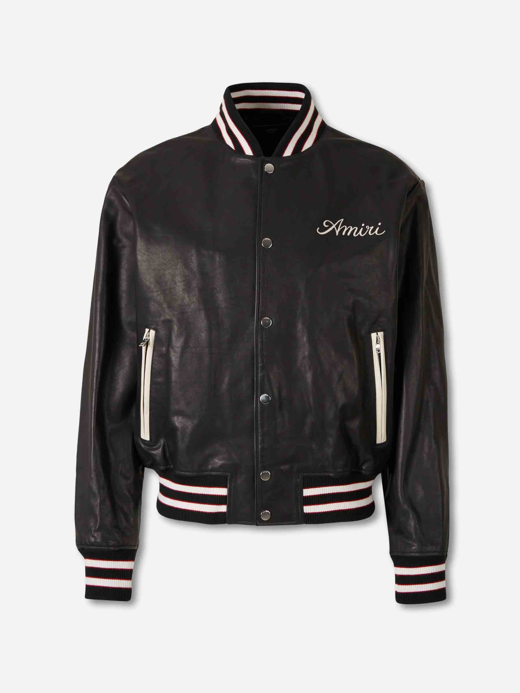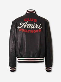 SKU: 512-002712 01 BRAND ID: AMLTVY1003 Leather Bomber Jacket Leather Jacket By Amiri • Embroidered logo on the chest and back and zip pockets at the front • Ribbed cuffs and hem • Made of grained leather • Leather Jacket • Front snap button closure • Ribbed collar 100% leather Turkey