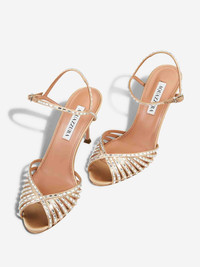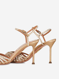 SKU: 801-000030 02 BRAND ID: HMCMIDS0-SAT Aquazzura shoes • Crystal ornaments • 8.5 cm stiletto heel • Padded leather insole • Details with the distinctive logo • Made from satin fabric • High heels • Adjustable buckle closure • Exterior: patent leather; Sole: leather • Made in: Italy