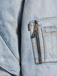 SKU: 772-001569 01 BRAND ID: 851006TTWB1 Bomber Jacket By Balenciaga • Bomber jacket • Made from cotton denim • Bomber collar • Front zip closure • Flap pockets with snap closures on the front and a zip pocket on the left sleeve • Details of worn-out and faded effect • Ribbed hem and cuffs • Composition: 100% cotton • Made in: Japan