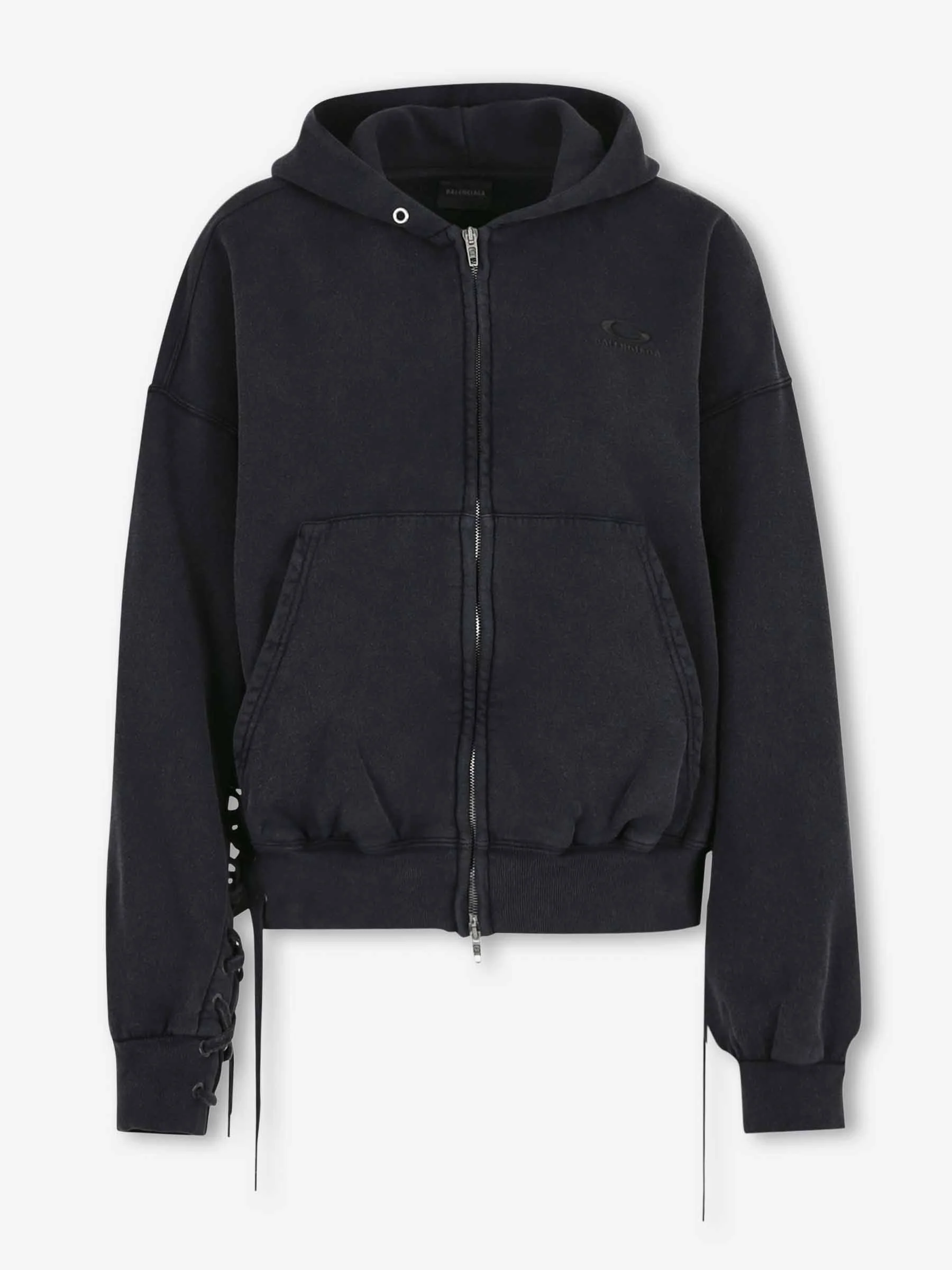 SKU: 715-000233 01 BRAND ID: 858125TTVS2 Sweatshirt By Balenciaga • Hoodie • Cropped fit • Made of cotton terry cloth • Adjustable hood with drawstring • Front zip closure • Ribbed elastic cuffs and hem • Front kangaroo pocket • Composition: 100% cotton • Made in: Portugal