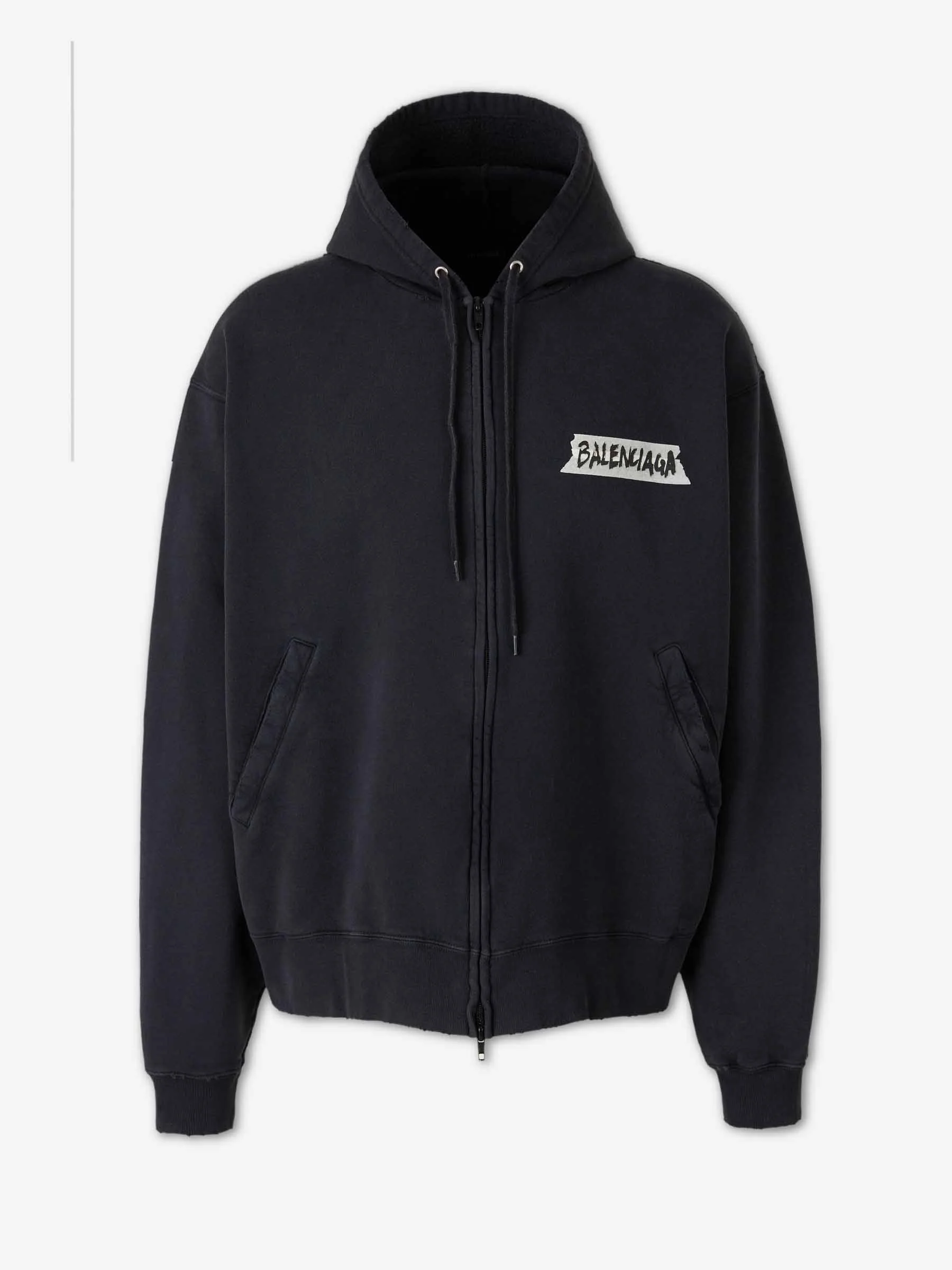 SKU: 545-002056 01 BRAND ID: 850338TTVL7 Balenciaga sweatshirt By Balenciaga • Ribbed cuffs and hem • Side pockets • Oversized fit • Masking tape printed on the front • Made of cotton terry cloth • Hoodie • Front zip closure • Composition: 100% cotton • Made in: Portugal