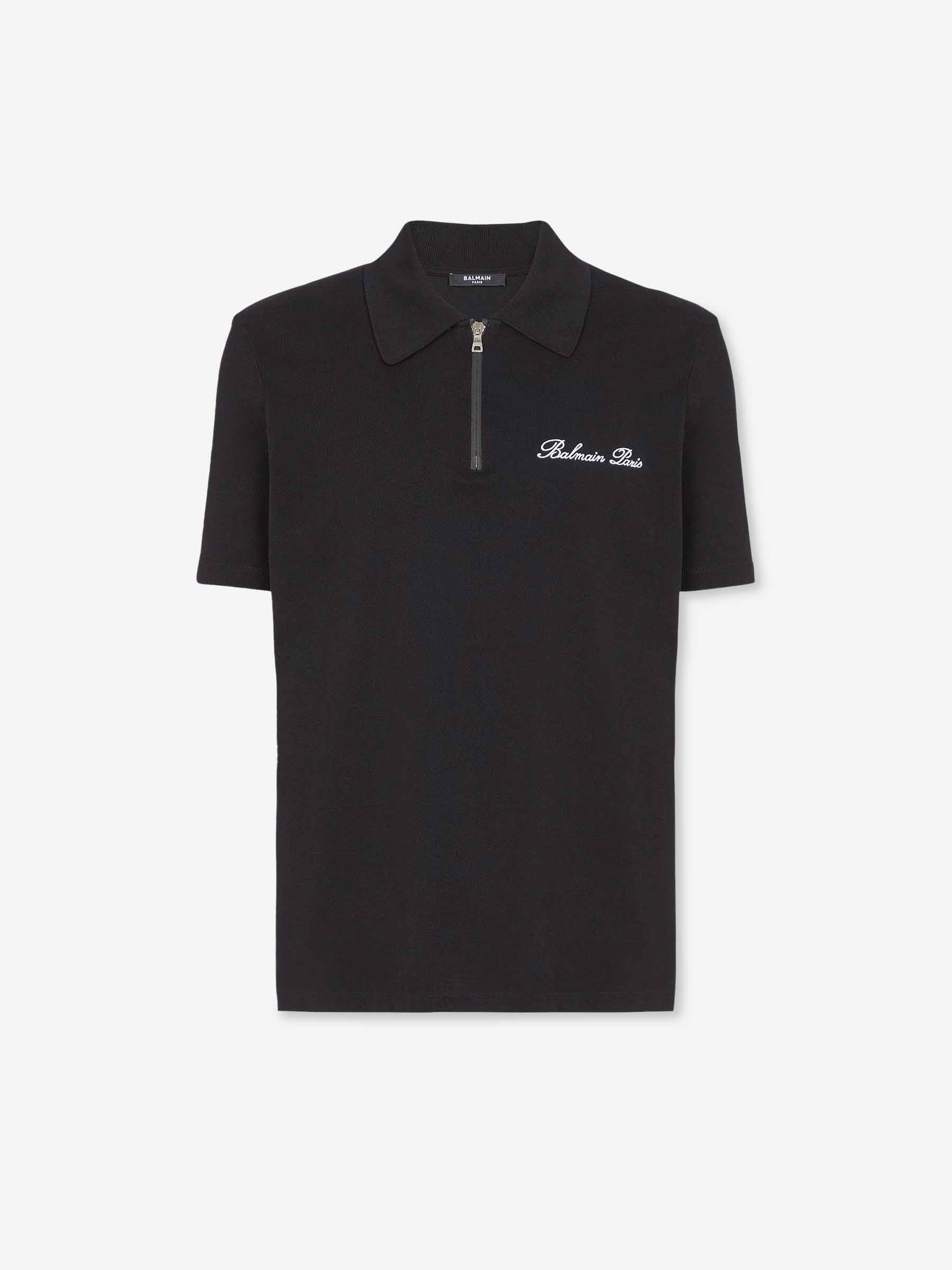 SKU: 552-001617 01 BRAND ID: DH1GC028BC78 Polo by Balmain • Regular fit • Made of cotton pique • Contrast Balmain Signature embroidery on the front • Engraved silver metal handle • Zip-up neck • Short sleeve • Ribbed neck Made in Portugal 100% cotton