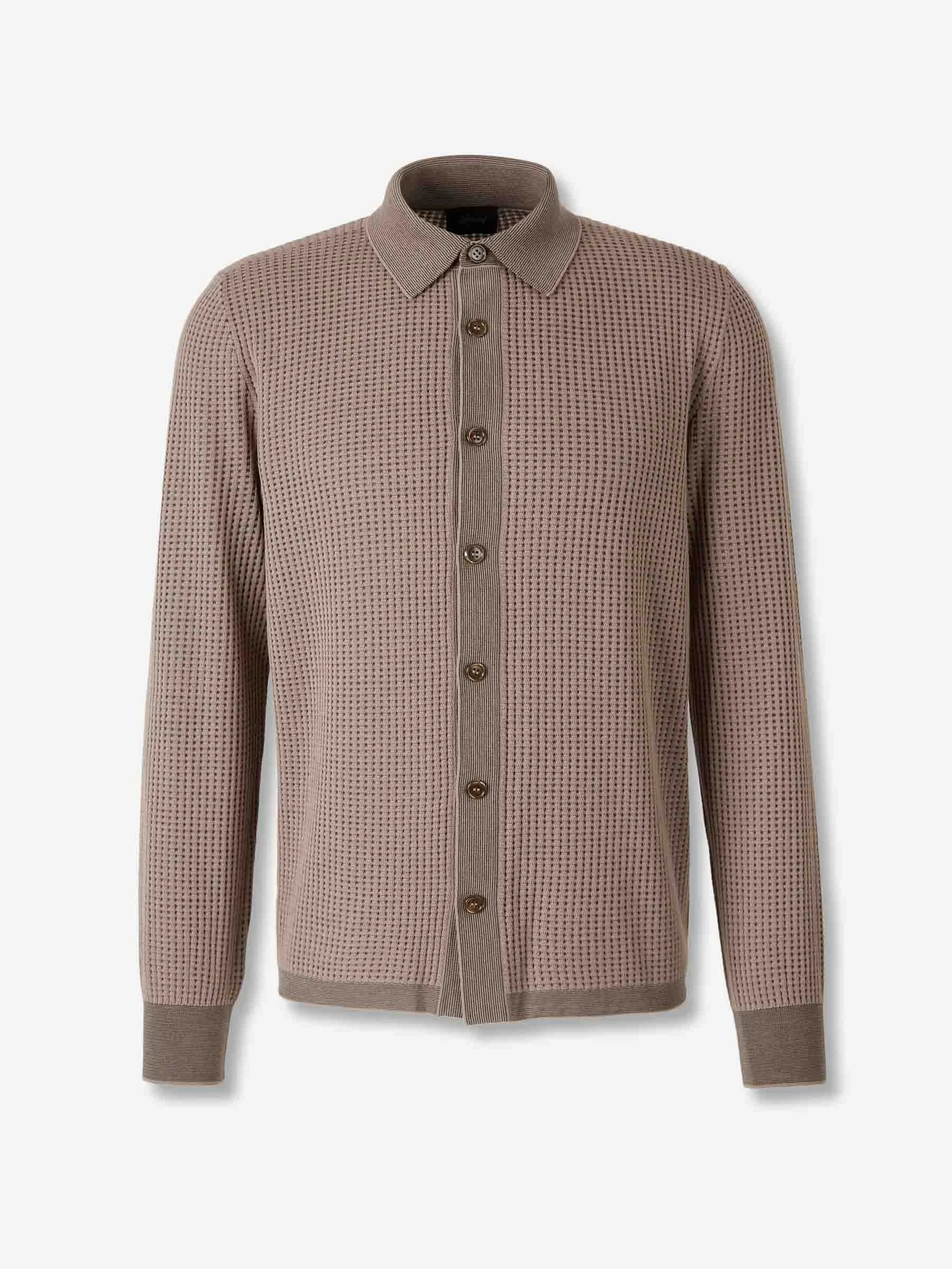 SKU: 543-001092 01 BRAND ID: UMIV0LODK09 Cardigan By Brioni • Ribbed finishes on cuffs and hem • Mother-of-pearl buttons • Regular fit • Contrast details at hem, cuffs, collar and central closure • Knitted in wool • Gauge 18 • Front closure with buttons • Shirt collar • Composition: 80% wool, 20% silk • Made in: Italy