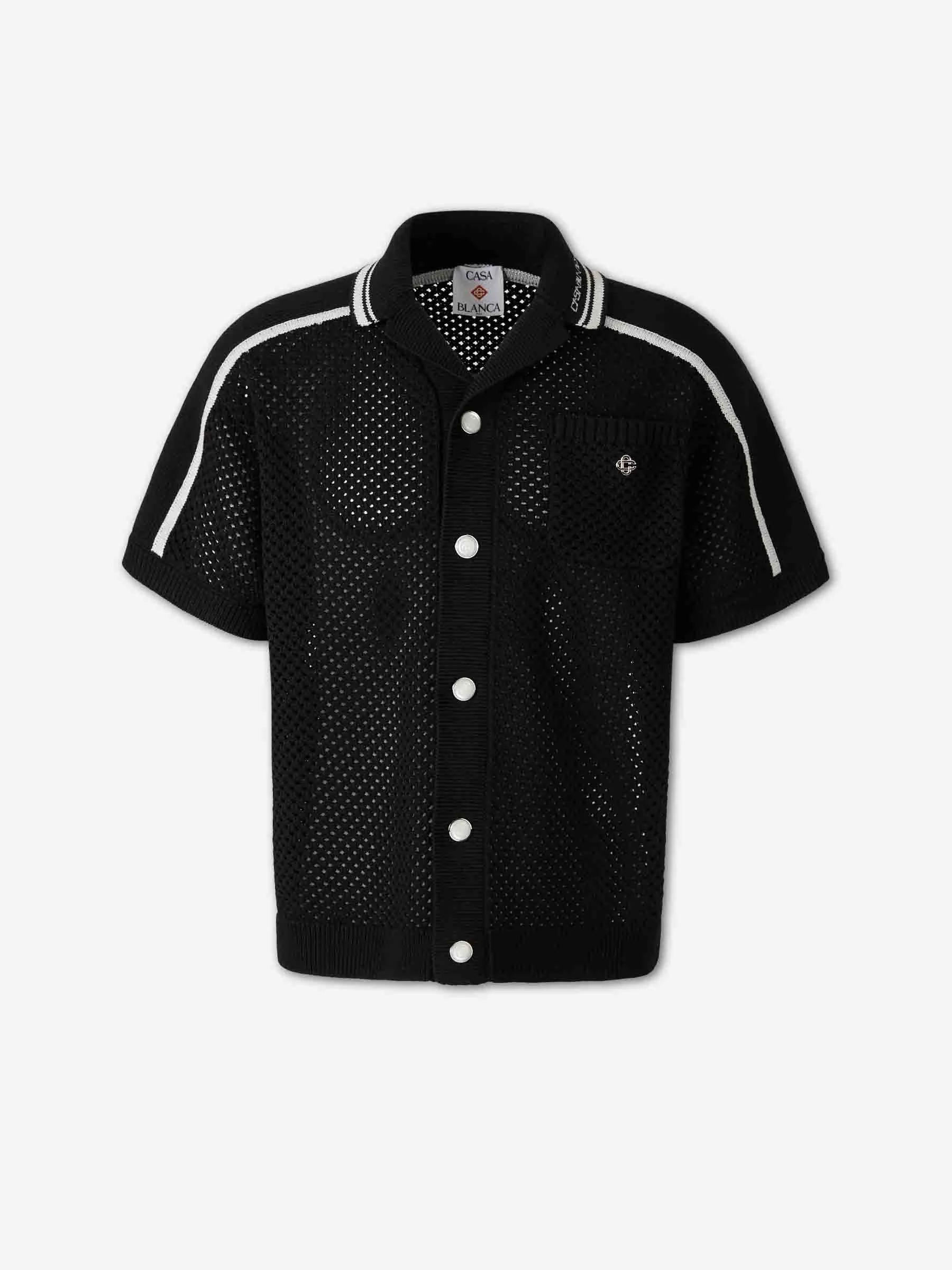 SKU: 532-000766 01 BRAND ID: M-SS26-KW-1320-01 Shirt By Casablanca • Casual shirt • Relaxed fit • Made from a cotton blend mesh • Cuban collar • Front button closure • Striped details on the shoulders and sleeves • Short sleeve • Defined seams, back yoke, and discreet side opening for greater mobility • Composition: 52% cotton, 48% polyester • Made in: China