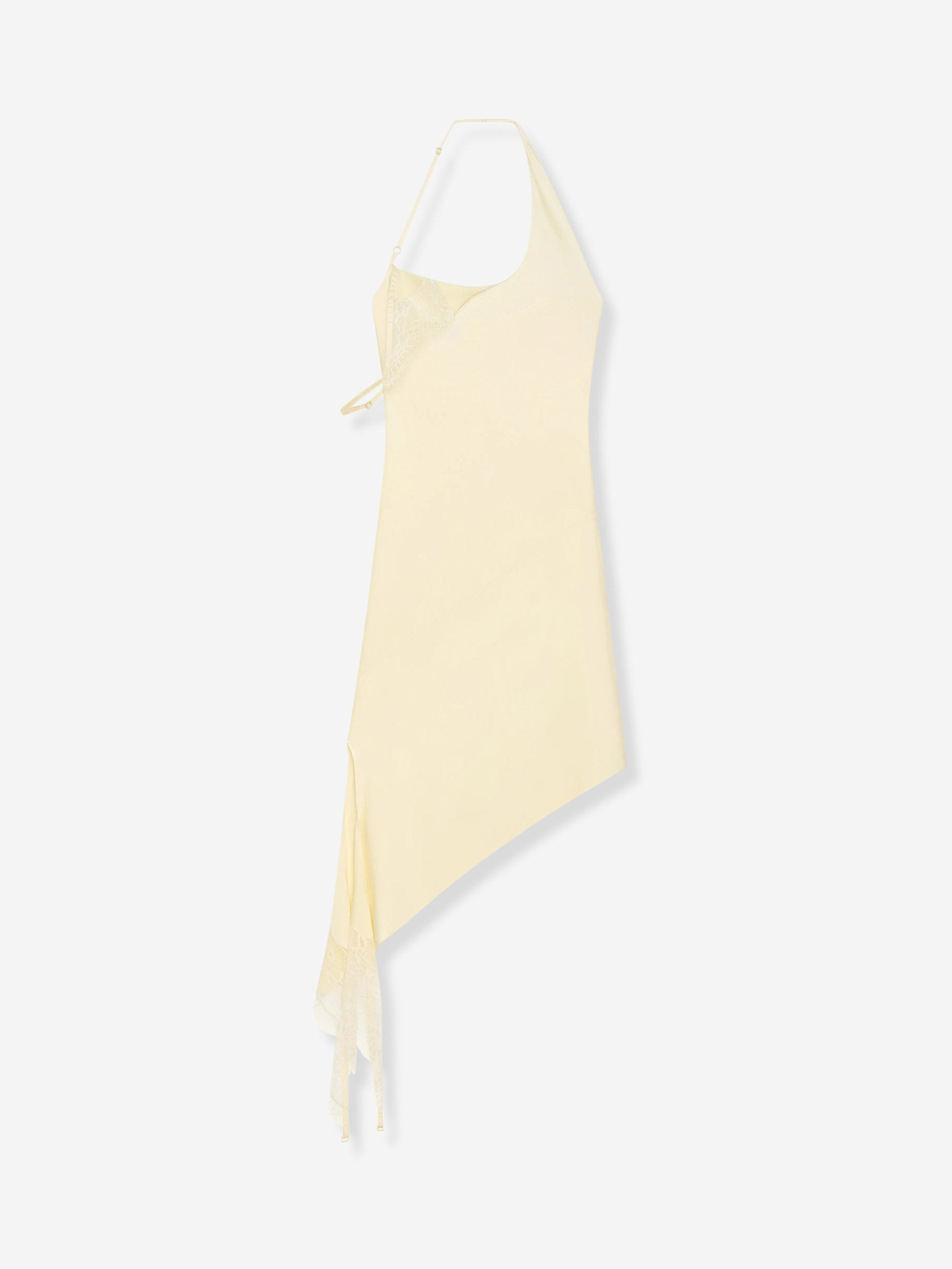 SKU: 731-006079 01 BRAND ID: 325CRO667VI0073 Asymmetrical Satin Dress Midi dress By Courreges • Fitted cut • Halter neck • Round neck and long sleeve • Tailored fit • Elastic satin blend • Midi dress • Thin straps Composition: 94% Viscose fiber, 6% Elastic fiber Made in: France