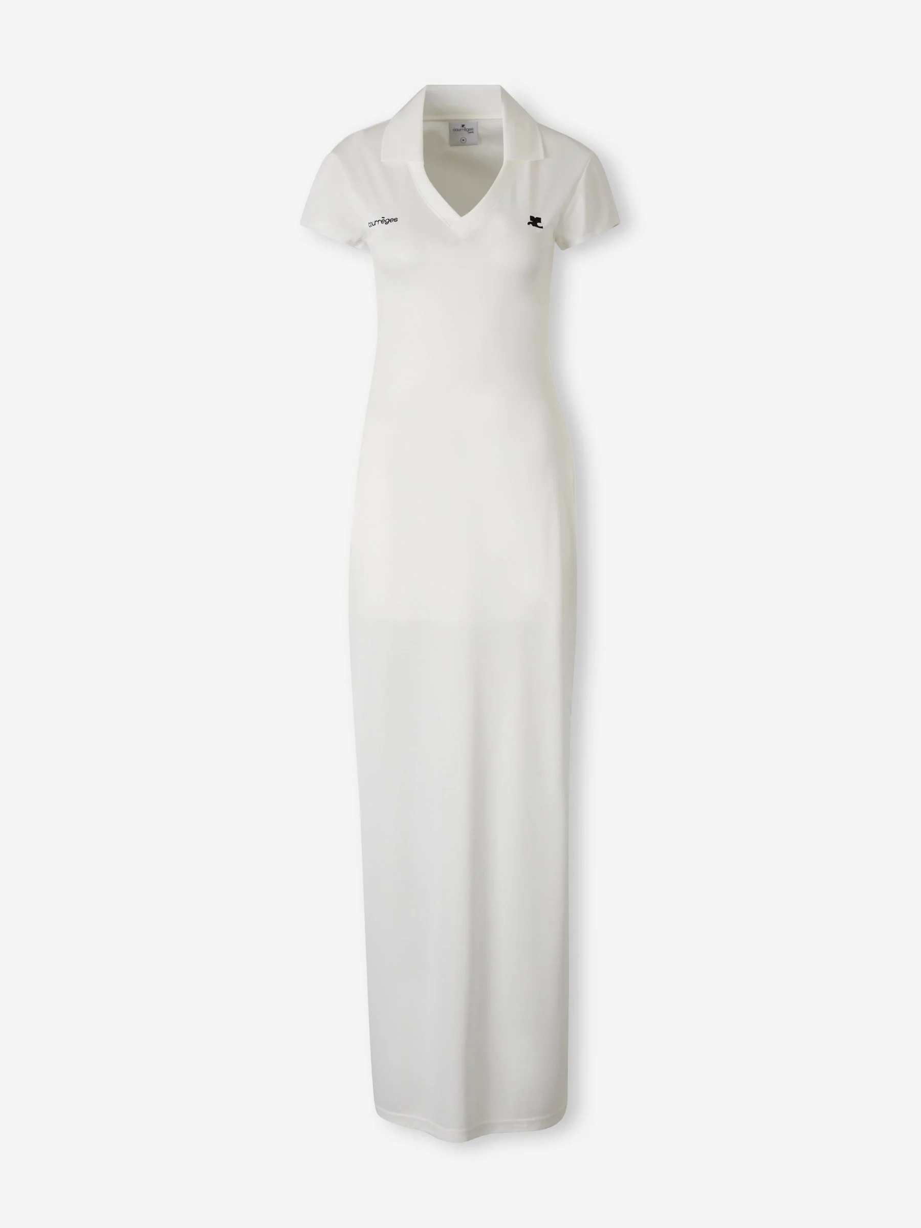 SKU: 721-000701 01 BRAND ID: 126JRO807JS0195 Dress By Courreges • Maxi dress • Slim fit • Made from polyester fabric • V-neck • Double contrast front logo embroidery • Short sleeves • Contemporary design with a distinctive touch • Composition: 100% polyester • Made in: Portugal