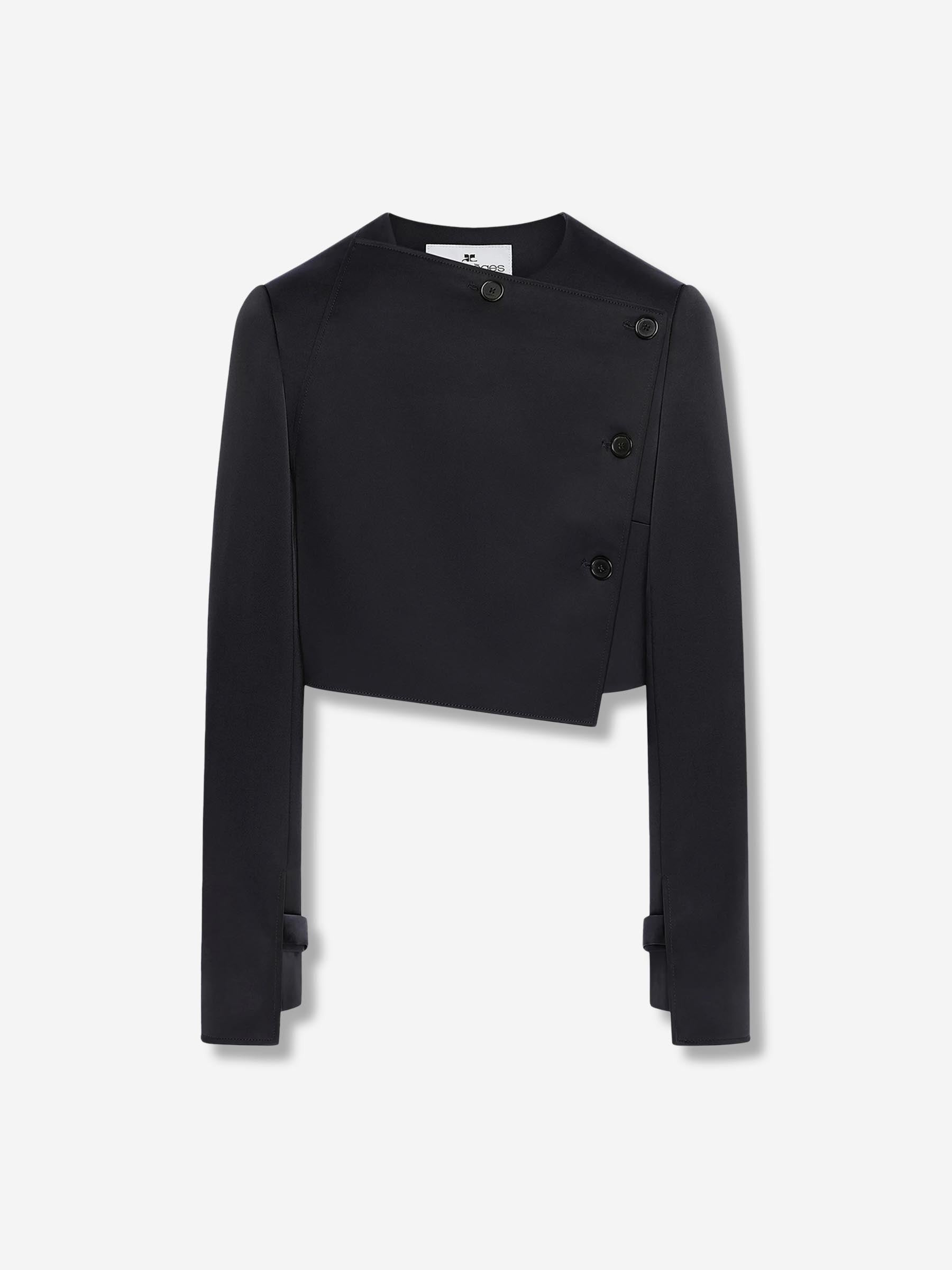 SKU: 771-001666 01 BRAND ID: 425CVE138TA0007 Oblique Satin Jacket Coat By Courreges • Cropped style with embroidered logo at the nape • Minimalist design with clean lines • Made from satin fabric of triacetate and polyester • Long coat • Cross front closure with buttons • Asymmetrical collar 83% triacetate, 17% polyester Slovakia