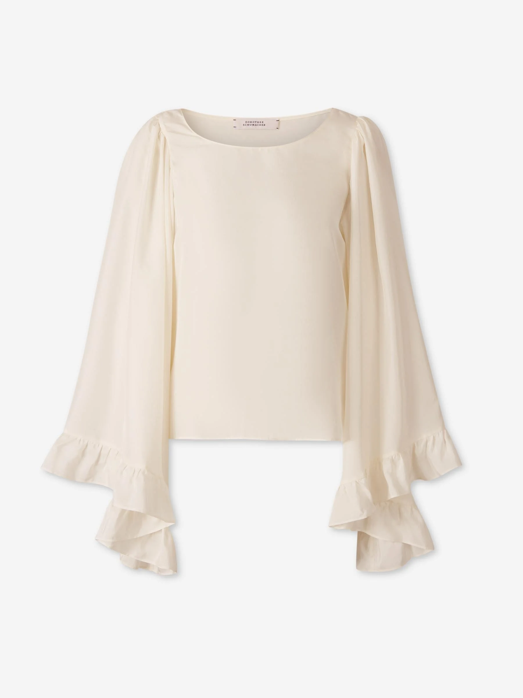 SKU: 701-002463 01 BRAND ID: 261_447016 Blouse By Dorothee Schumacher • Plain blouse • Loose fit • Made from silk fabric • Round neck • Exaggerated tunic-style sleeves with ruffles. • Composition: 100% silk • Made in: Italy