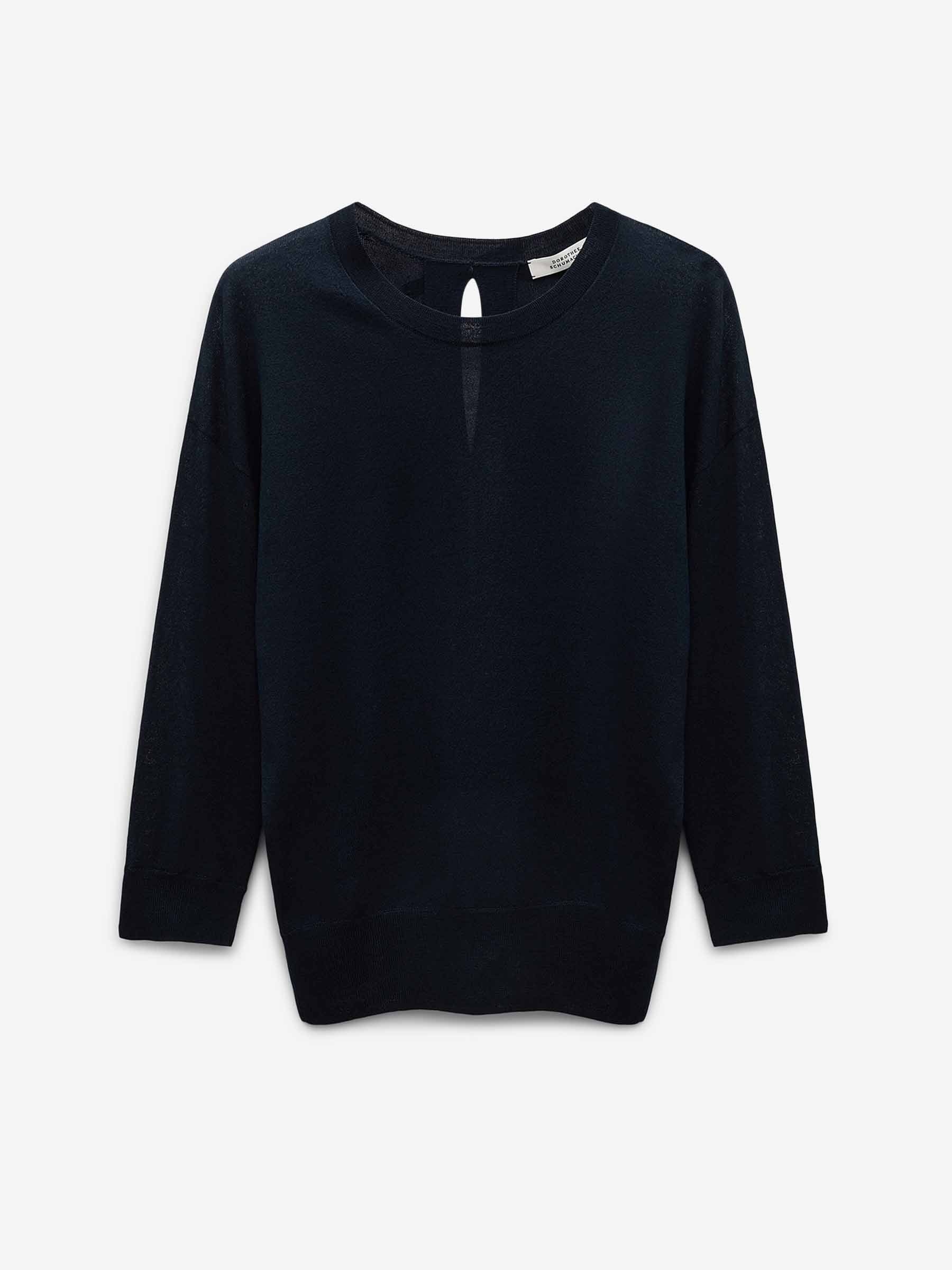 SKU: 711-003339 02 BRAND ID: 252-110504 Sweater by Dorothee Schumacher • Made of soft virgin wool and cotton knit • Abertura en la espalda con lazos de saten extraibles • Parte superior drapeada y relajada • Round neck • Acabados riveteados • Magnas 3/4 • Back length: 56 cm Made in China 52% virgin wool, 48% cotton