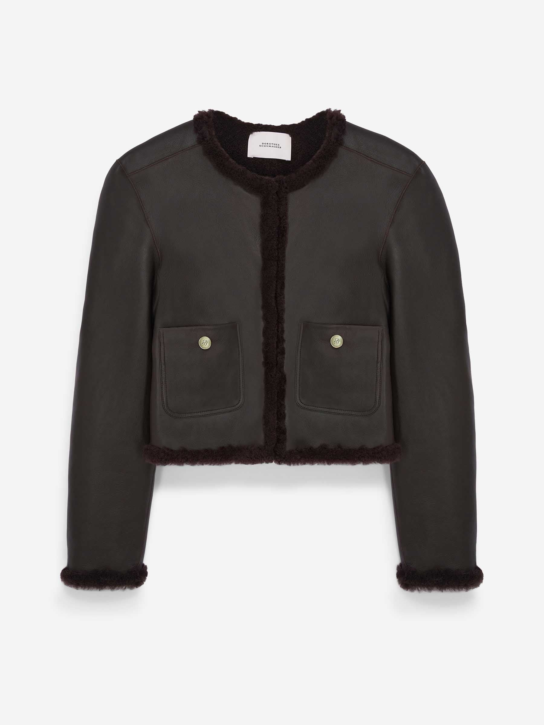 SKU: 741-002260 01 BRAND ID: 253_244202_799 Reversible Leather Jacket Reversible leather jacket By Dorothee Schumacher • Round neck • Piped and patch pockets • Light A-line cut • Made of sheepskin • Reversible leather jacket • Front closure with gold buttons 100 % lambskin Italy