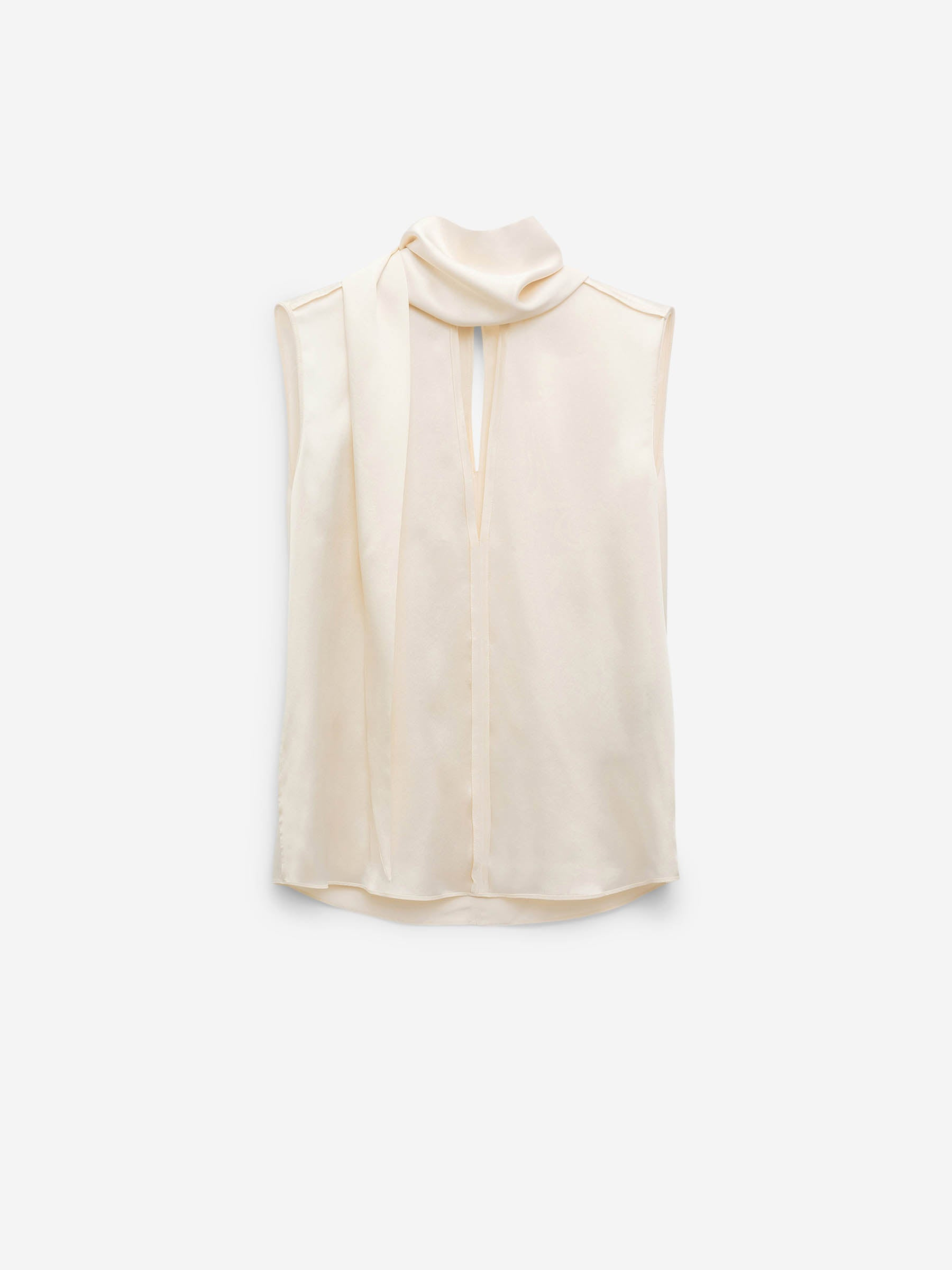 SKU: 702-000494 01 BRAND ID: 253_247326_120 Silk Bow Blouse Blouse By Dorothee Schumacher • Detail of pleats at the front • No print • Sleeveless • Made of silk • Plain blouse • V-neck with bow detail Composition: 100% Silk Made in: Italy