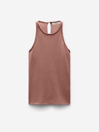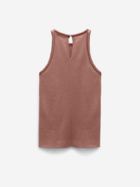 SKU: 703-002444 01 BRAND ID: 252-110501 Top by Dorothee Schumacher • Sleeveless • Made of virgin wool and cotton knit • Lightly quilted silk trim around neckline and armholes • Round neck • Buttoned opening at the nape of the neck Made in China 52% virgin wool, 48% cotton