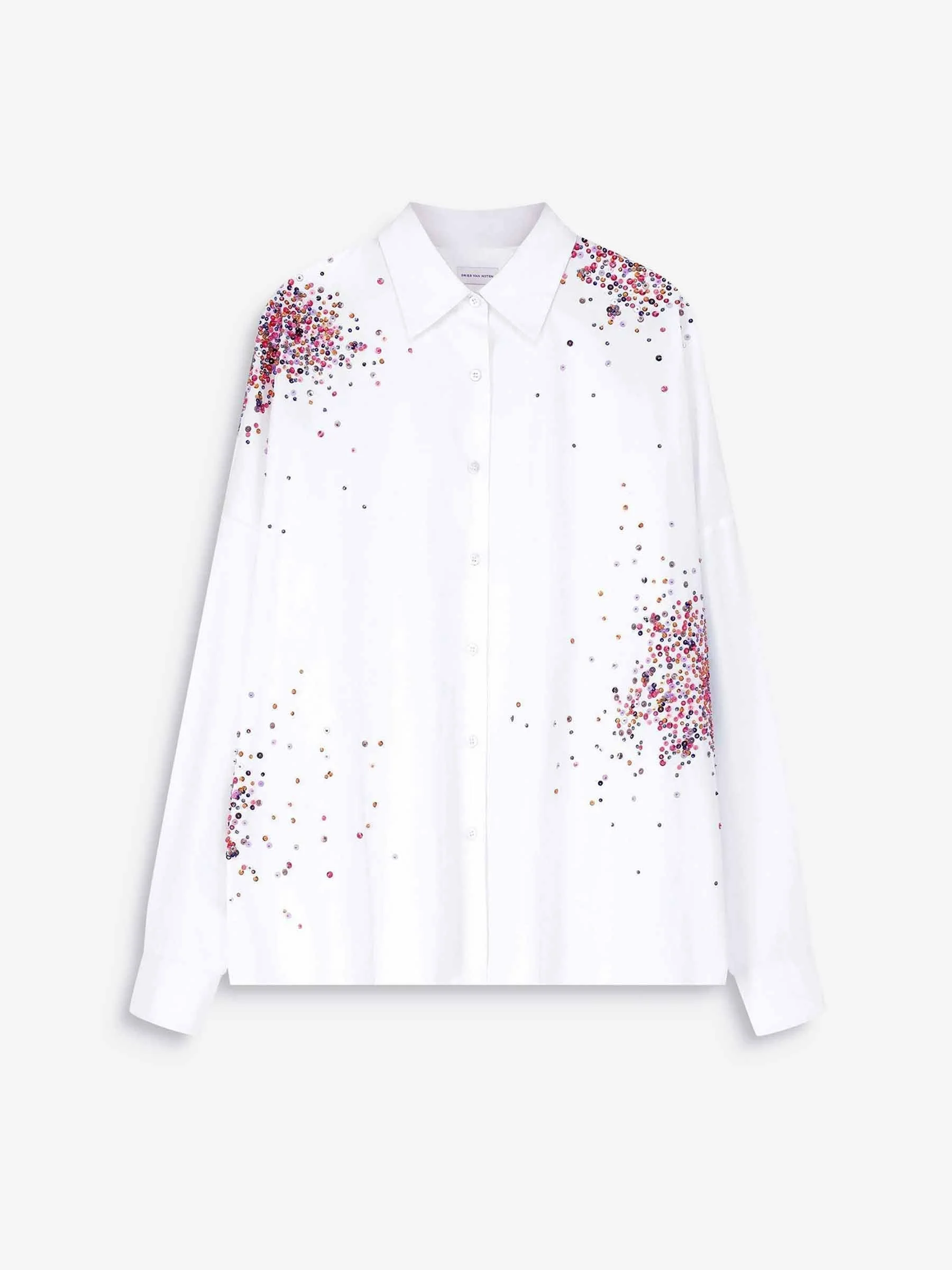 SKU: 701-002382 01 BRAND ID: 261-130759-3314 Shirt By Dries Van Noten • Shirt with embellishments • Oversized • Kimono sleeves • Buttoned cuffs • Front button closure • Made from cotton poplin • Details of all-over multicolored decorations • 100% Cotton