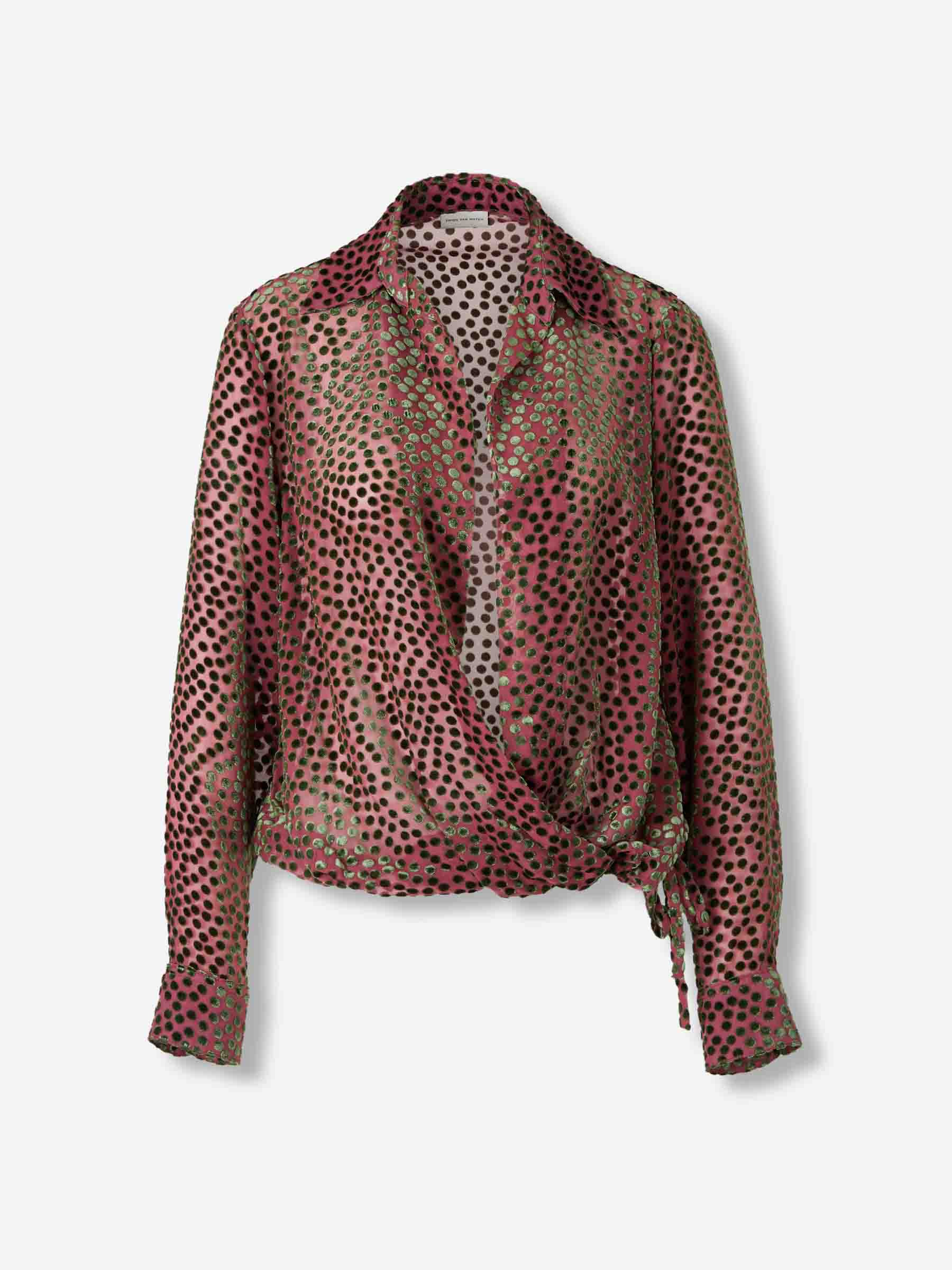 SKU: 701-002317 01 BRAND ID: 252-010702-2039 Devore Cross Blouse Blouse By Dries Van Noten • Regular fit • Polka dot print • Button cuffs • Made from double-dyed viscose and devore silk • Printed blouse • Cross front tie closure • Shirt collar with V-neck 67 % viscose, 33 % silk Italy