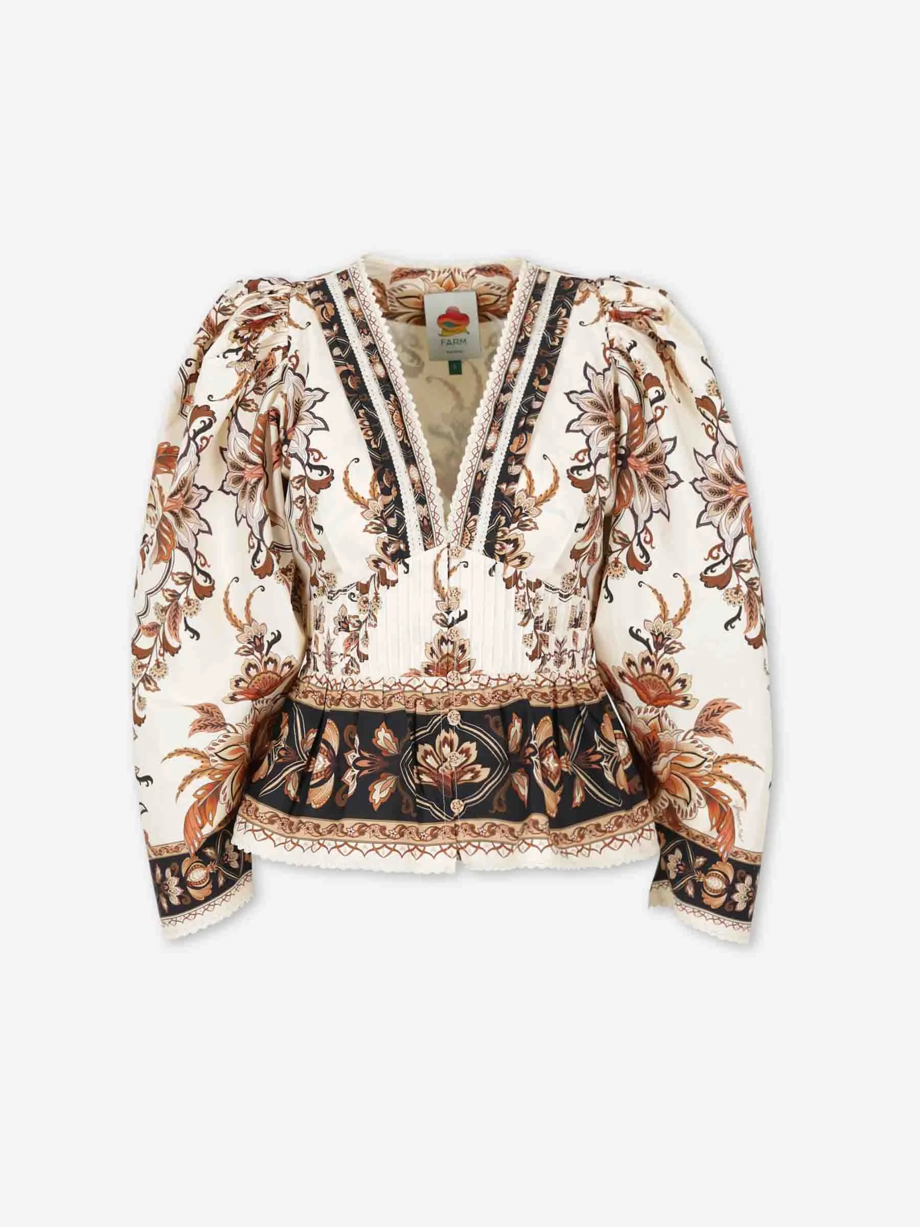 SKU: 701-002425 01 BRAND ID: 344141 Blouse By Farm Rio • Printed blouse • Made from cotton fabric • V-neck • Front button closure • Floral print • Puffed sleeves • Lace details • Composition: 100% cotton • Made in: China