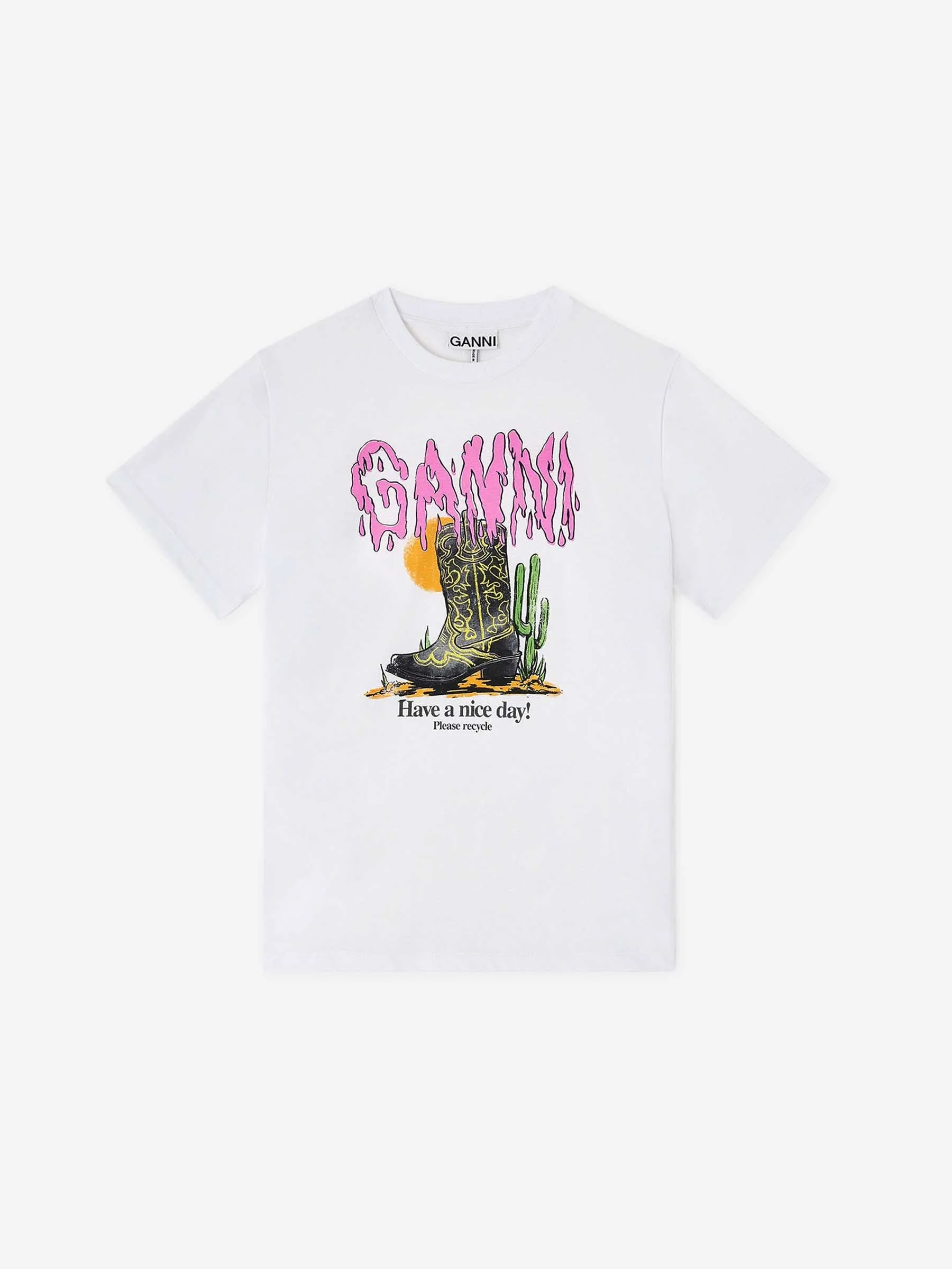 SKU: 782-001871 01 BRAND ID: A1050075 T-shirt By Ganni • Relaxed fit • Graphic print of GANNI • Made in cotton fabric • Round neck • Short sleeve • Composition: 100% cotton • Made in: Portugal