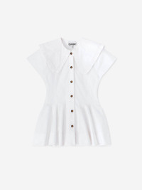 SKU: 702-000513 01 BRAND ID: A1040093 Blouse By Ganni • Flared hem • Made from cotton fabric • Short sleeve • Front button closure • Ruffled collar • Composition: 97% organic cotton, 3% elastane • Made in: India