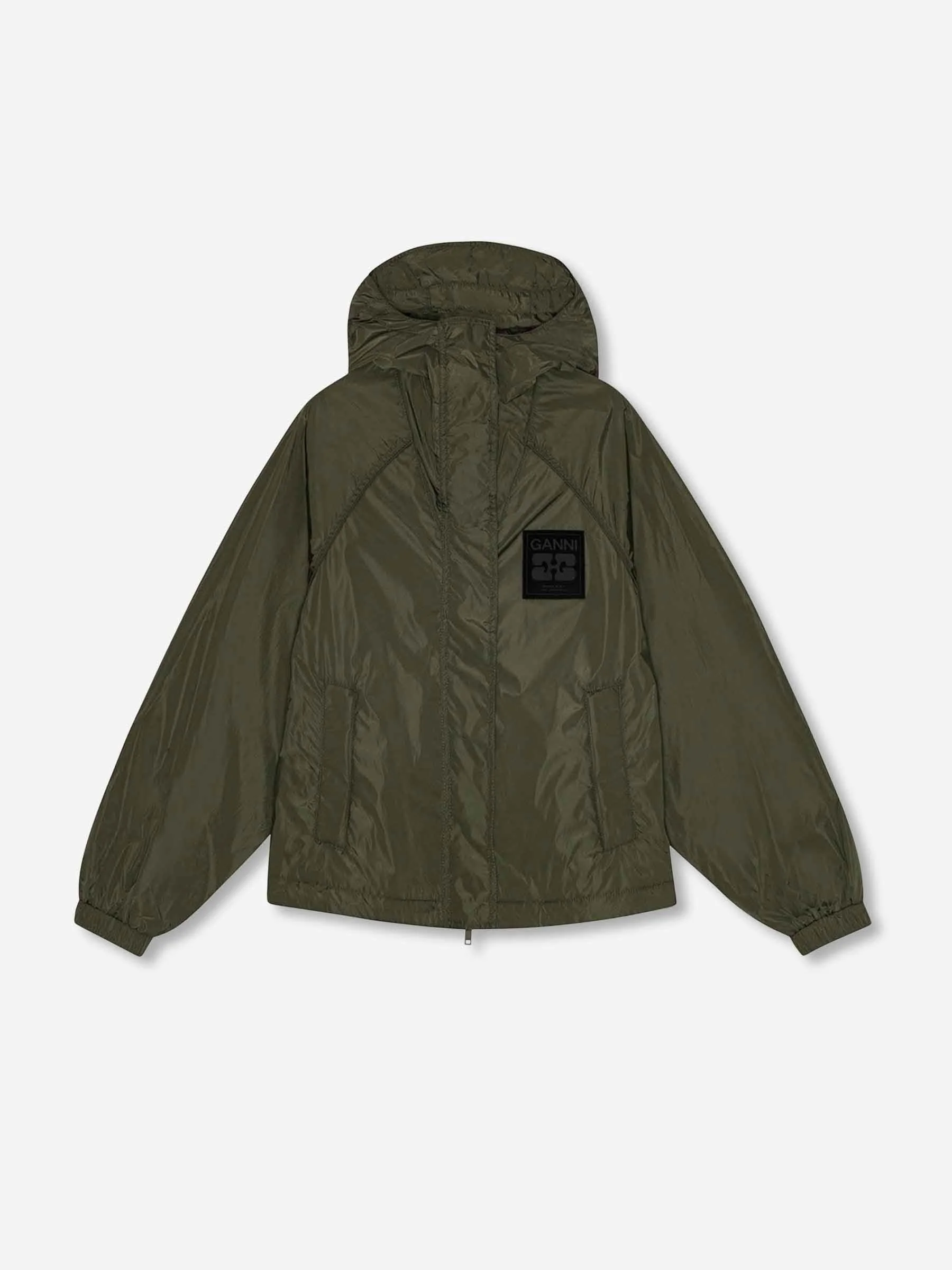 SKU: 772-001566 01 BRAND ID: W0737 Technical jacket By Ganni • Side pockets • Patch with GANNI logo on the chest • Made from technical fabric • Technical jacket • Front closure with hidden zipper! • High collar with integrated hood • Composition: 100% recycled nylon • Made in: China