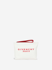 SKU: 811-000018 01 BRAND ID: BB60PNB2C8 Mini Clutch Bag Clutch Bag By Givenchy • A main compartment with a flat pocket inside • 22 x 19 x 5 cm • GIVENCHY Paris branding on the front • Made of cotton canvas • Grosgrain strap with leather lining. • Top zip closure 58% cotton, 38% linen, 4% polyurethane Made in: Italy