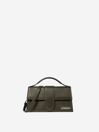 SKU: 810-008253 01 BRAND ID: 22HBAW00007AC01C02 Bag Le Grand Bambino Bag By Jacquemus • Structured leather bag • Padded top handle • Magnetic flap closure with tongue • Detachable long strap • Medium size • Metal pieces and silver metal logo • Overlaid pocket on the back • Stitching and tinted edges details • Full cotton lining • Dimensions: 23.5 x 13 cm 100% calfskin Italy