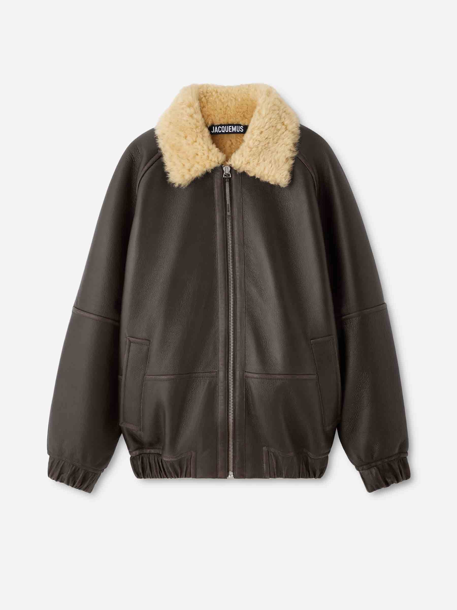 SKU: 511-000631 01 BRAND ID: 25HOUM00128AC16L05 Bombay Jacket Aviator jacket By Jacquemus • Large piped pockets • Raglan sleeve with elastic cuffs and fitted elastic hem • Made of double-faced sheepskin • Aviator jacket • Zipper closure with long leather pull • Contrast fur pointed collar Composition: 100% lambskin Turkey