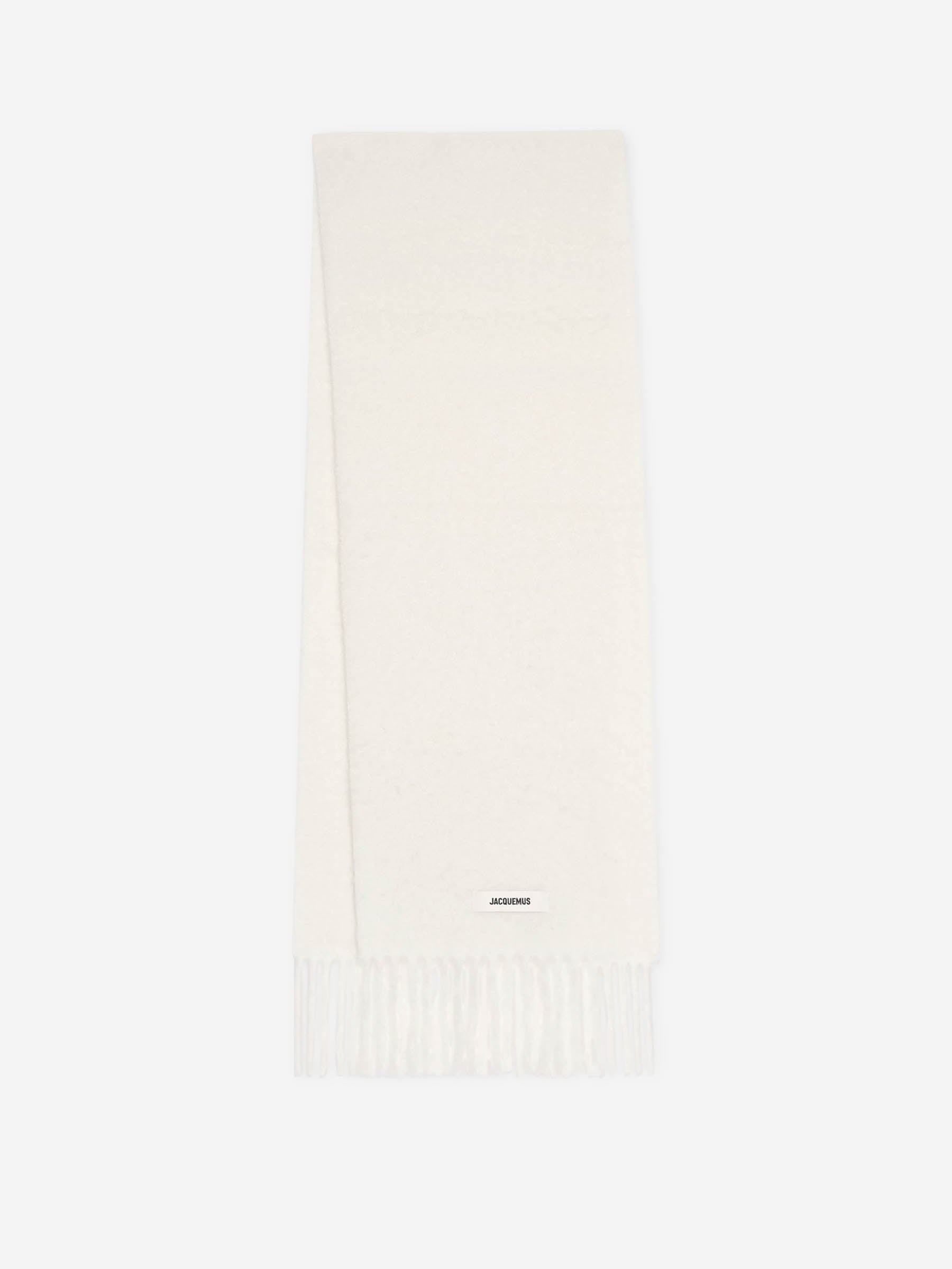 SKU: 796-000123 01 BRAND ID: 24HACU00572BOT4032 Carro Scarf Scarf By Jacquemus • Edges with 17 cm fringes • 251 cm x 40 cm • Discreet embroidered logo • Crafted from the highest quality mohair-alpaca Composition: 28% mohair - 28% alpaca wool - 24% virgin wool - 20% polyamide Made in: Italy