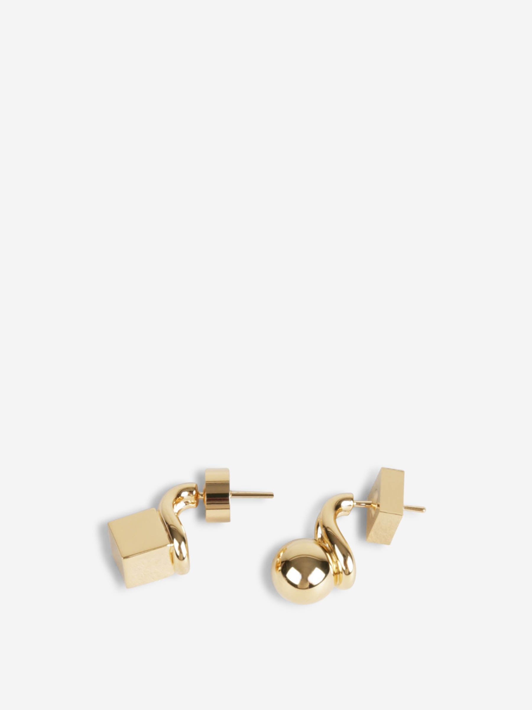 SKU: 850-001967 01 BRAND ID: 24HJWW00715AOT4005 Les Puces Nodo Earrings Earrings By Jacquemus • Engraved circle and square button earrings • Cotton • 3D circle and square imitation diamond charms suspended and mismatched • Plated brass with smooth finish Composition: 100% brass Made in: Italy