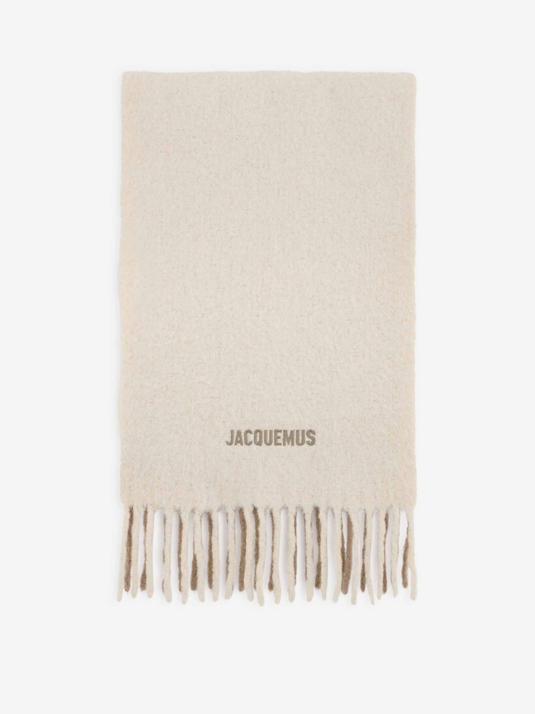 SKU: 796-000124 01 BRAND ID: 23HACU00574AOT4032 Moisson Scarf Scarf By Jacquemus • 38 x 225 cm • 10 cm fringes on both ends • Contrast embroidered logo • Made from hand-dyed alpaca wool Composition: 80% alpaca wool, 20% polyamide Italy