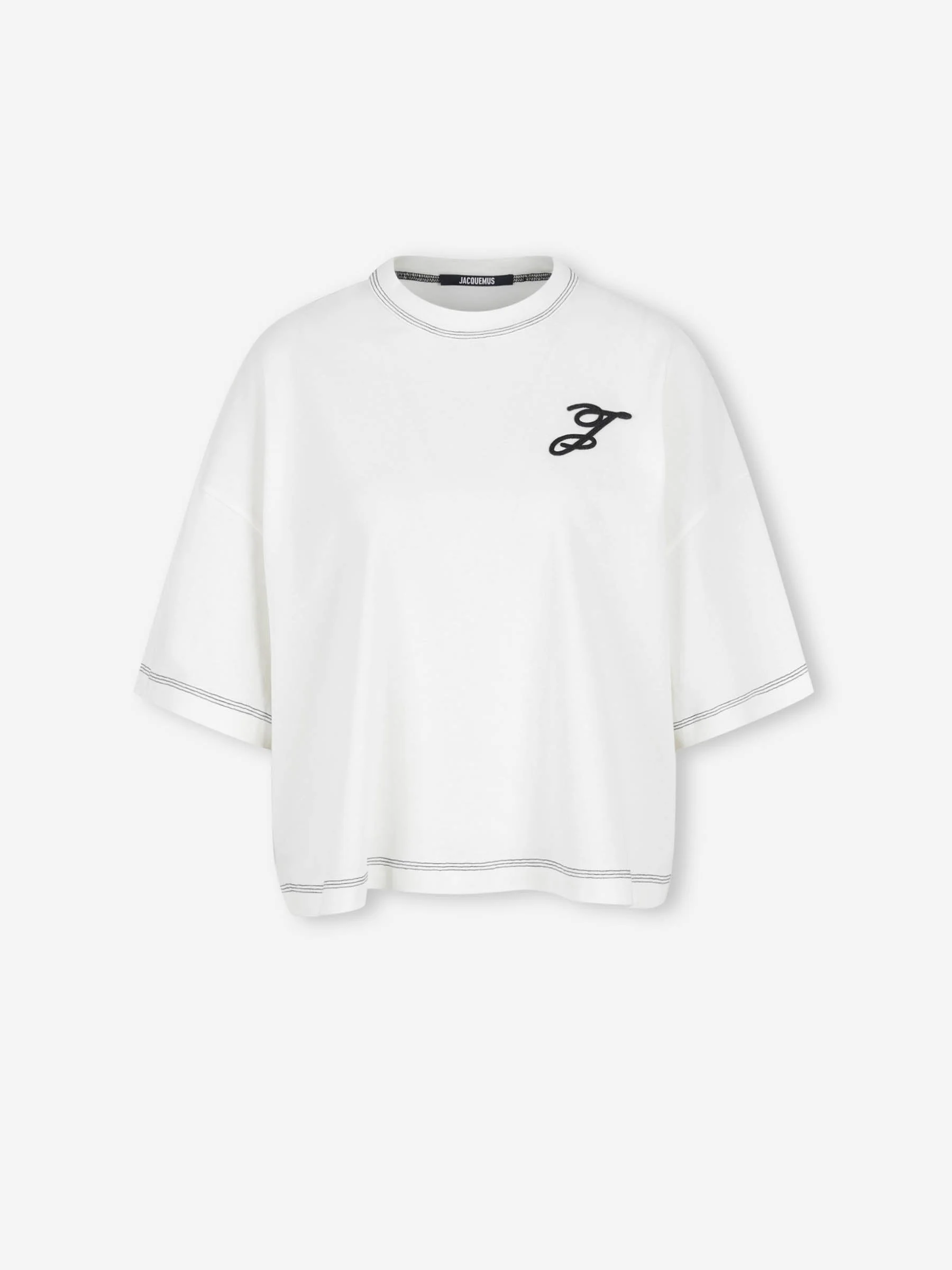 SKU: 782-001863 01 BRAND ID: TSW00580AJ00226 T-shirt By Jacquemus • Oversized • Made from cotton fabric • Graphic motif of the brand embroidered on the chest • Short sleeve • Contrasting stitching • Round neck • Composition: 100% cotton • Made in: Portugal