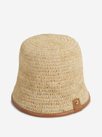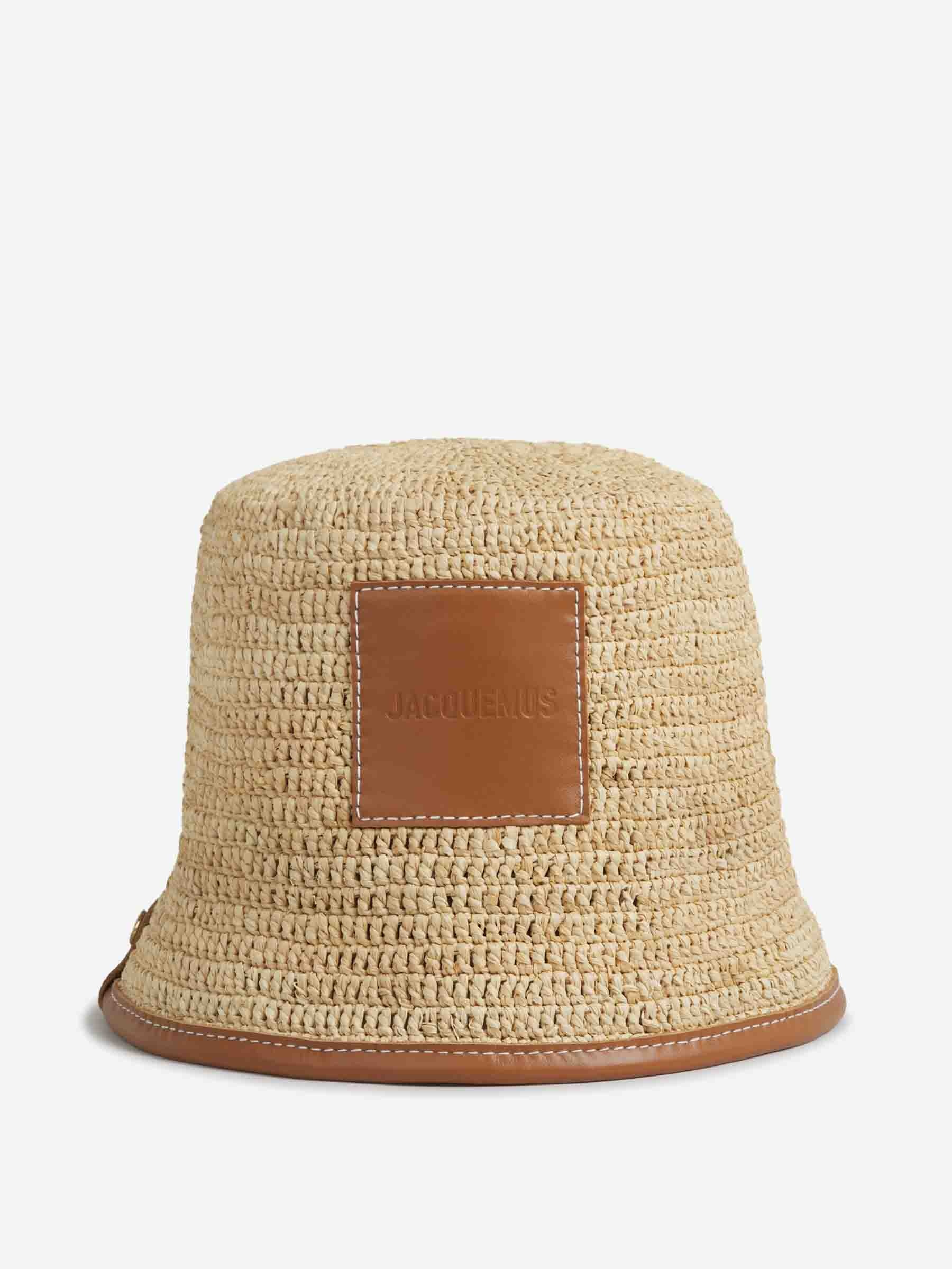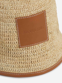 SKU: 899-001973 01 BRAND ID: 245AC642-3072 Hat by Jacquemus • Made of woven raffia • Fisherman design • Short visor and stitching • Leather logo patch Wing with leather trim and buckle with gold clip closure Made in Madagascar 100% Raffia. Patch: 100% Calfskin