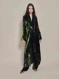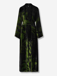 SKU: 771-001658 01 BRAND ID: PT03281 Kimono Alma Majestuosa Kimono By Johanna Ortiz • Palm tree motif print in tone • Made of viscose and silk velvet • Front tie closure • Deep neckline Composition: 82% Viscose, 18% Silk Colombia