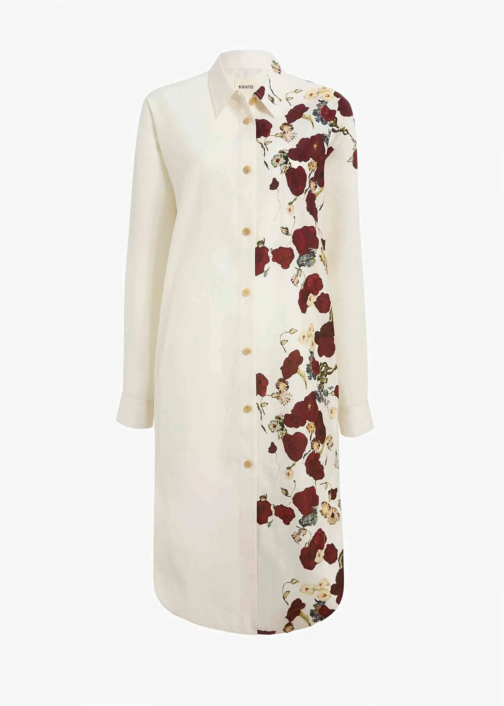 SKU: 721-000703 01 BRAND ID: 55803851 Dress By Khaite • Midi dress • Regular fit • Made from silk and cotton organza • Front button closure • Floral print • Exaggerated tail hem with side slits • Composition: 53% silk, 47% cotton • Made in: Italy