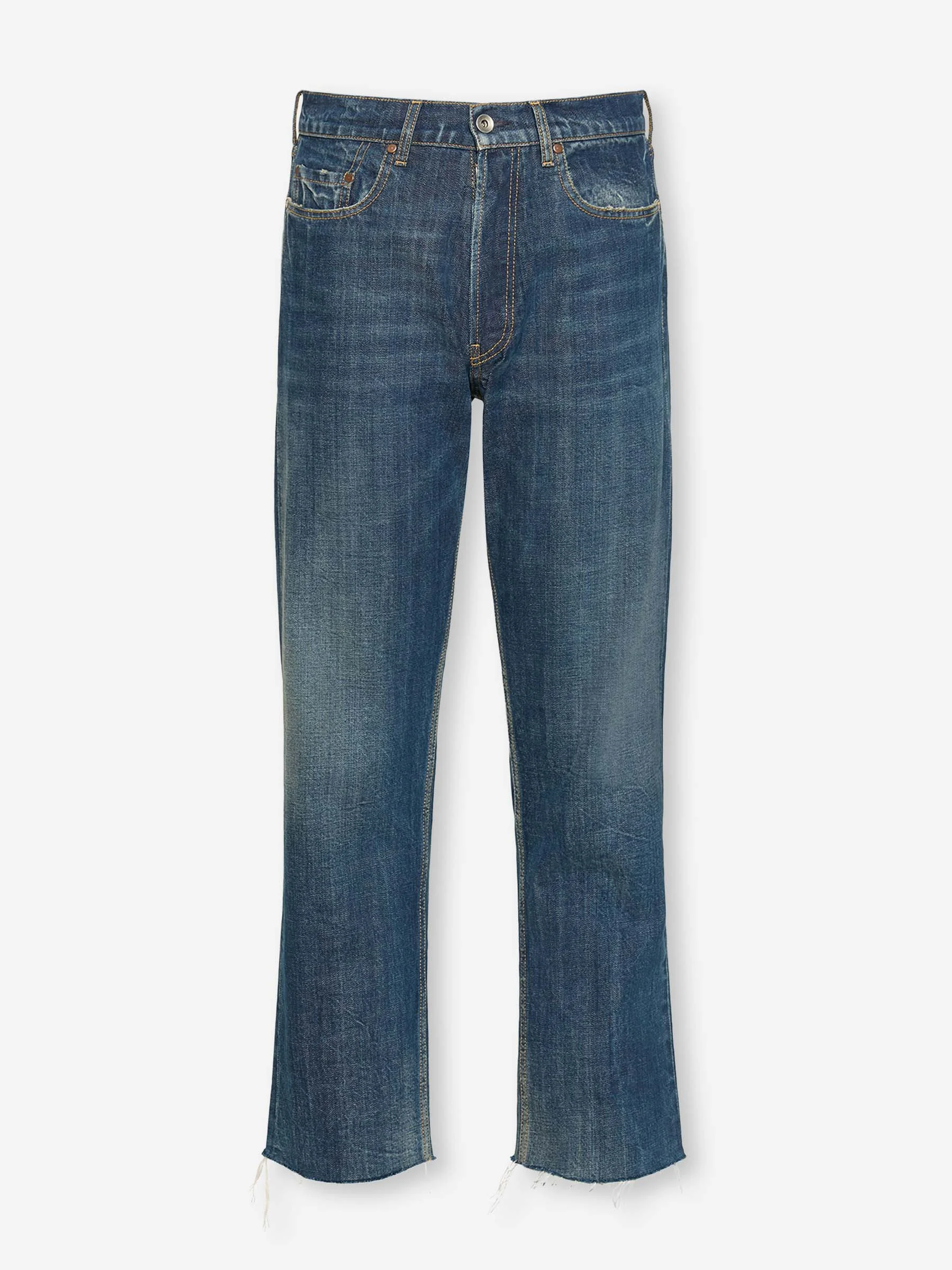 SKU: 522-002877 00 BRAND ID: S67LA0041 Straight Jeans Jeans By Maison Margiela • Three front pockets and two back pockets • Waist with belt loops • Features contrasting stitching with 4 stitches on the back • Regular fit • Made of cotton denim • Straight jeans • Frayed hem • Button closure at the front Composition: 100% cotton Italy