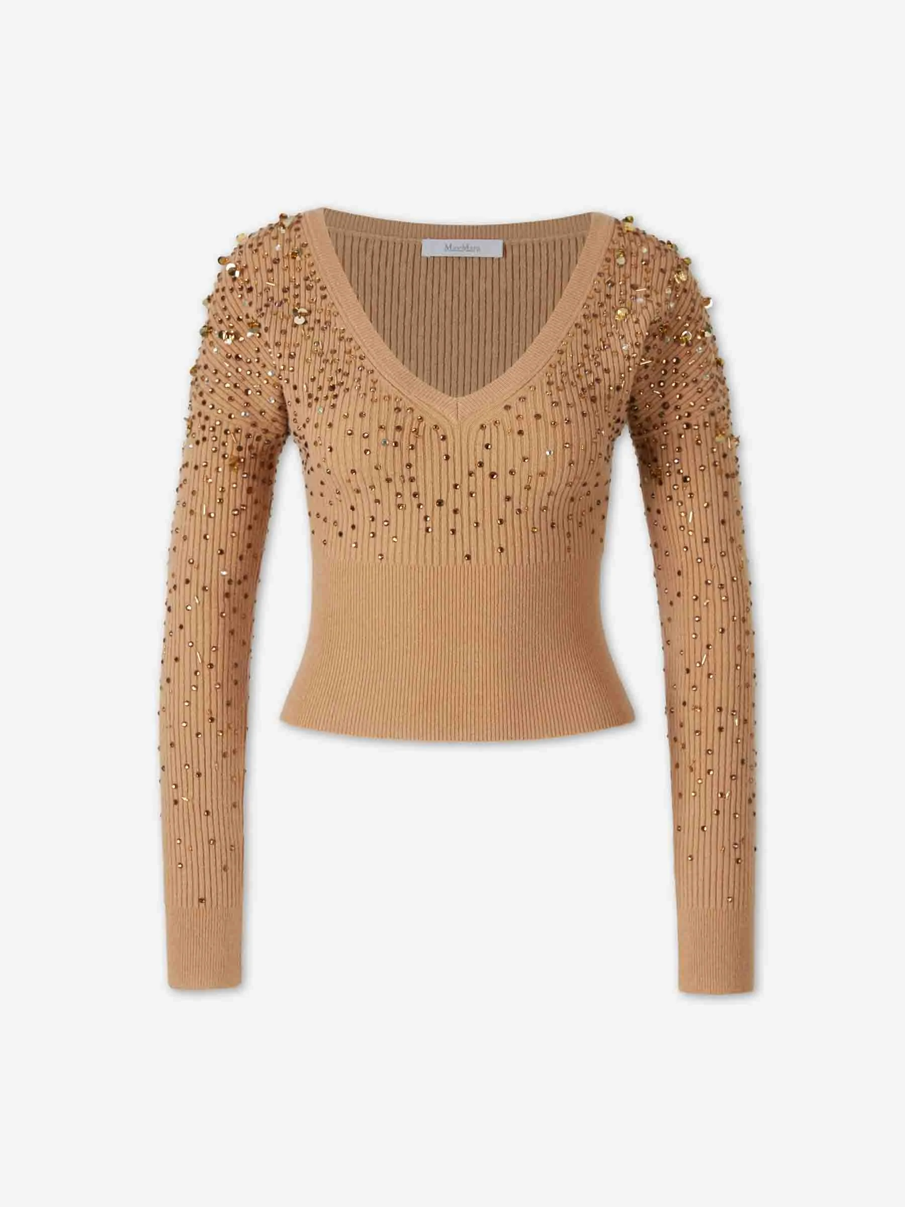 SKU: 711-003441 01 BRAND ID: 2611361051600 sweater By Max Mara • Slim fit • Made from wool and cashmere knit • V-neck • ribbed knit • Long sleeve with dropped armholes • Hand-embroidered rain effect sequins • Composition: 62% wool, 27% cashmere, 10% nylon, 1% elastane • Made in: Italy