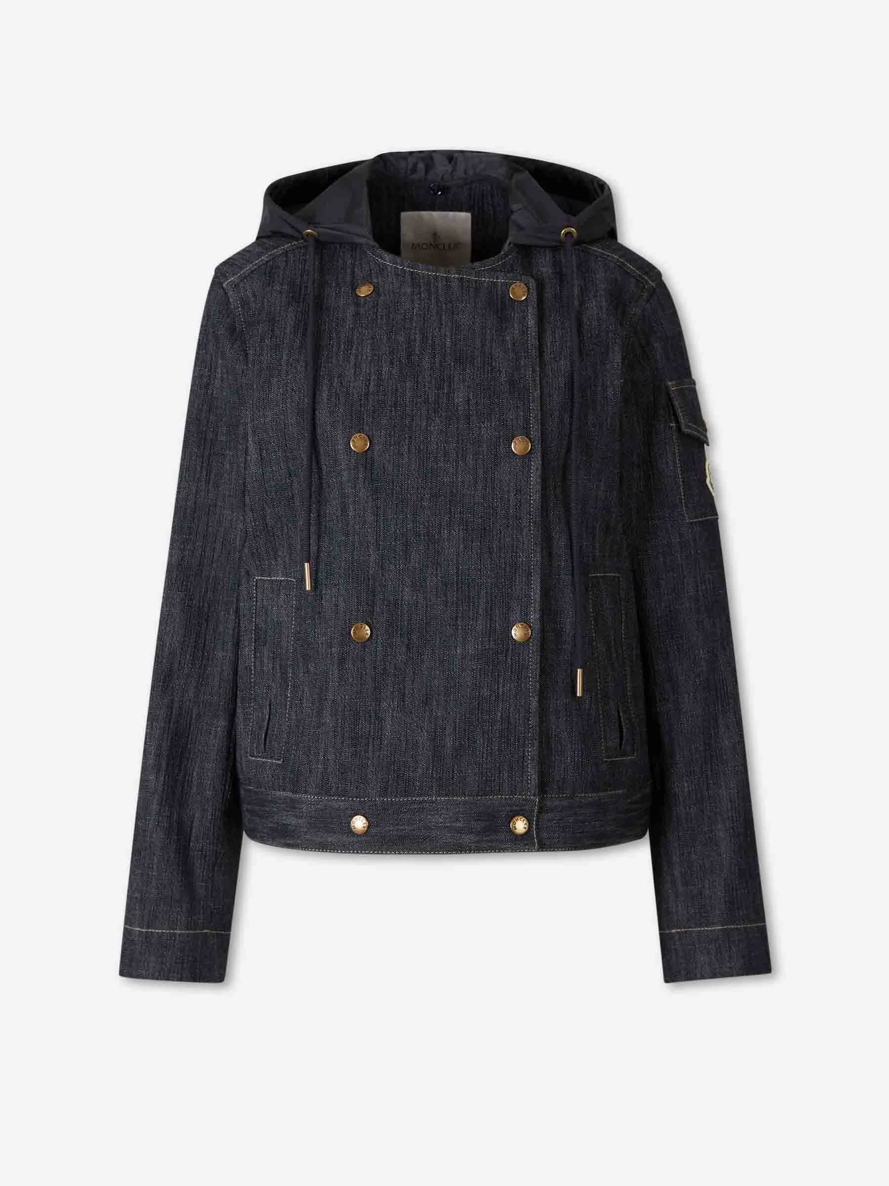 SKU: 772-001553 01 BRAND ID: L10931A00138599EP Jacket By Moncler • Denim jacket • Made from cotton denim • Removable and adjustable nylon hood • Snap button closure • Side pockets and sleeve pocket with snap button closure • nylon lining • Composition: 99% Cotton, 1% Elastane • Made in: Romania