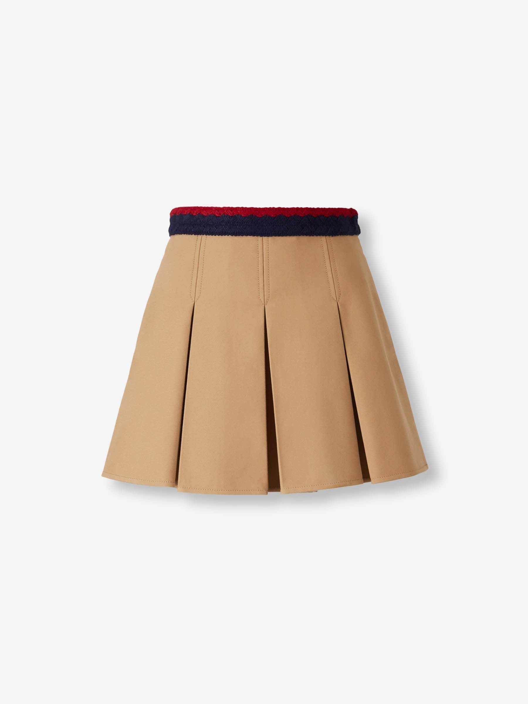 SKU: 750-001679 01 BRAND ID: K20932D00004598OP Skirt by Moncler • Mini • Made of cotton gabardine • Waistband with striped braided trim • Pleated • Invisible side zip fastening Made in Rumania Length: 37 cm 98% Cotton, 2% Elastane