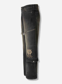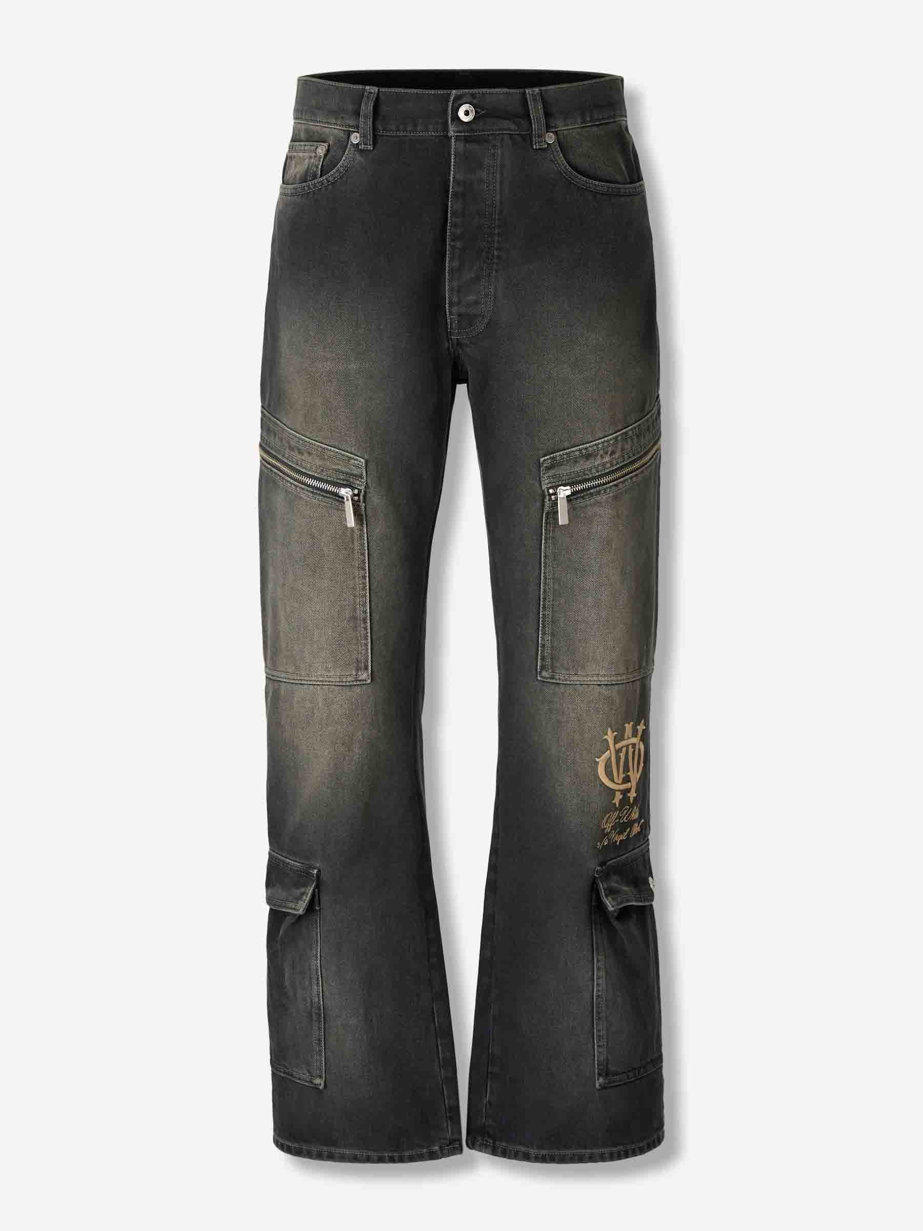 SKU: 522-002880 01 BRAND ID: MYA190F5D0011117 Flared Jeans Logo Flared jeans By Off-White • Design of 5 pockets • Waist with loops • Features multi-pockets with flap and zippers and tonal stitching • Relaxed fit • Made of cotton denim • Flared jeans • Flared hem • Front button closure Composition: 100% cotton Italy