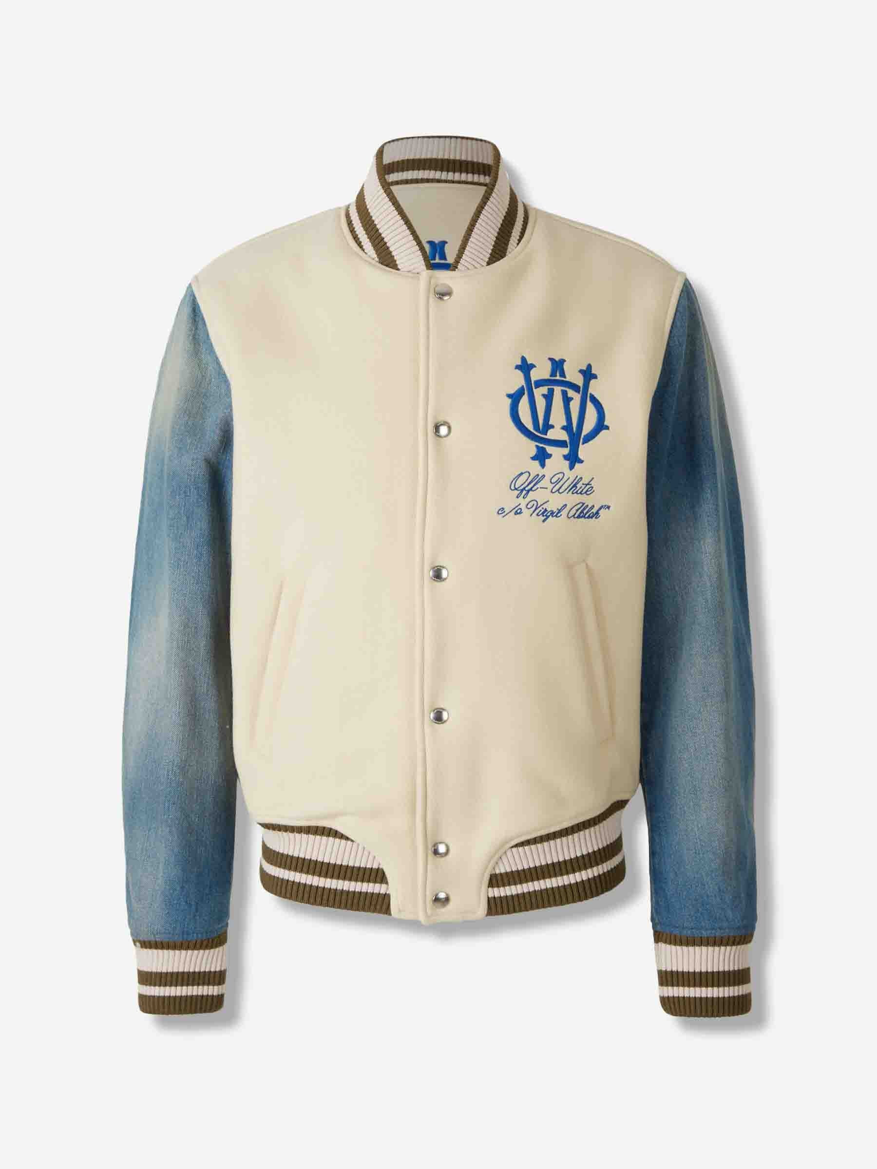 SKU: 512-002599 01 BRAND ID: MEH053F5F0041746 Gothic Bomber Jacket Bomber jacket By Off-White • Hem, cuffs and collar in ribbed • Sleeves in denim • Made in virgin wool fabric • Bomber jacket • Front closure with hidden buttons • Bomber style collar Composition: 75% wool, 25% polyester Italy