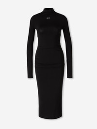 SKU: 721-000568 01 BRAND ID: 2DB55EF25JER001 Midi Dress Second Skin Midi dress By Off-White • High collar • Waist with side gathers • Design with printed logo on the front • Fitted • Made of elastic viscose fabric • Midi dress Composition: 95% viscose, 5% elastane Italy